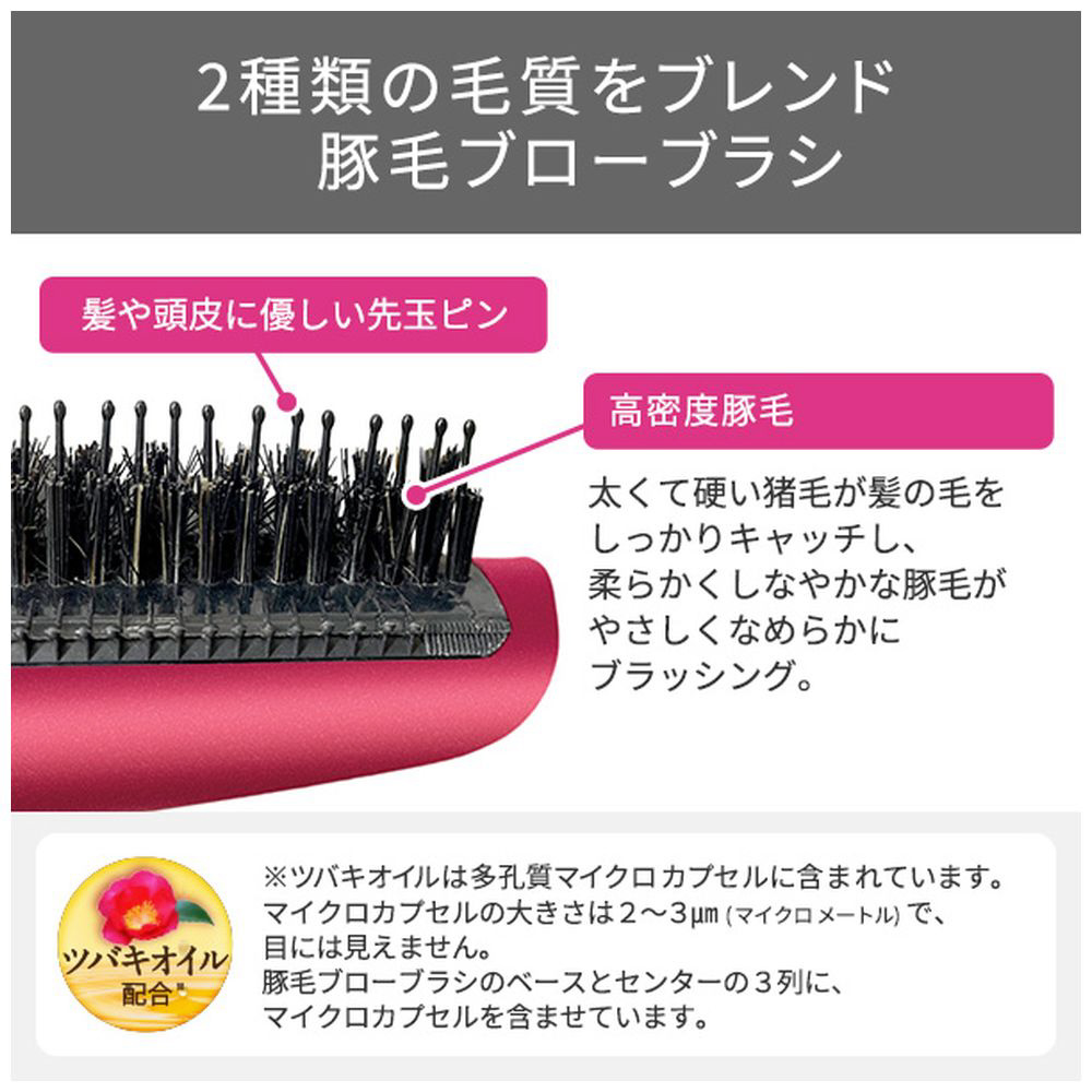 豚毛ブローブラシの黒色部分全面(ブラシセンター3列とブラシベース)にツバキオイルを配合したマイクロカプセルを含ませています。