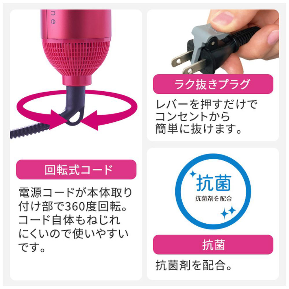 | 商品名 | マイナスイオンカールドライヤー【天然ツバキオイル配合豚毛ブローブラシ/ロールブラシ付属】 ピンク TC530A-P |