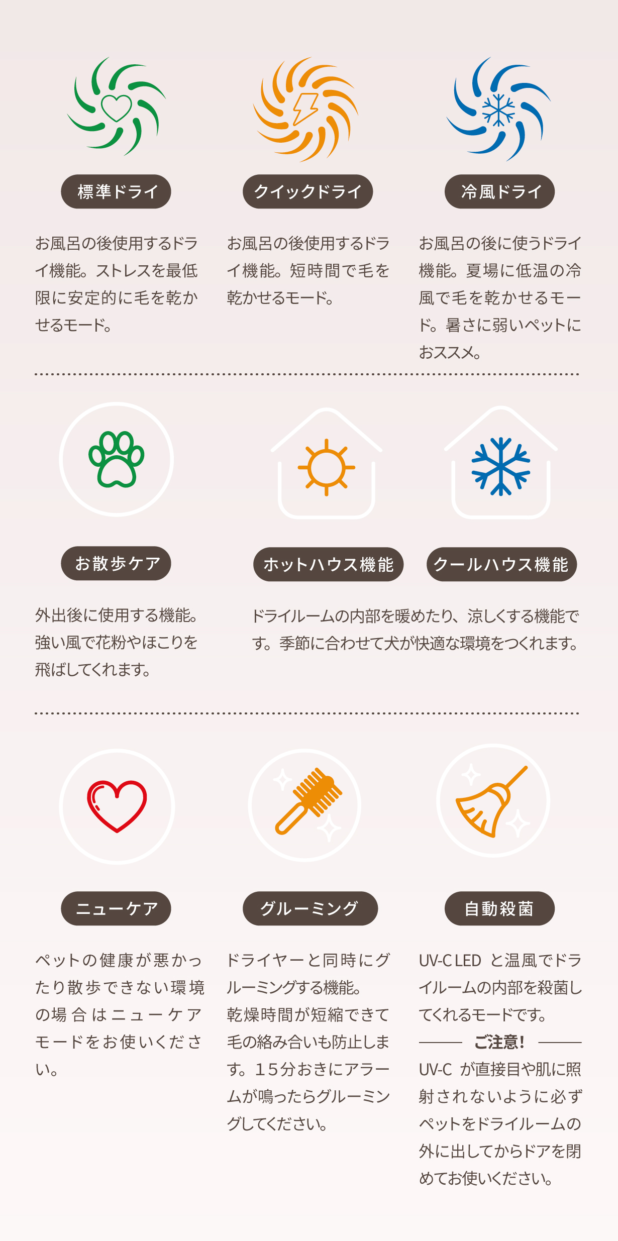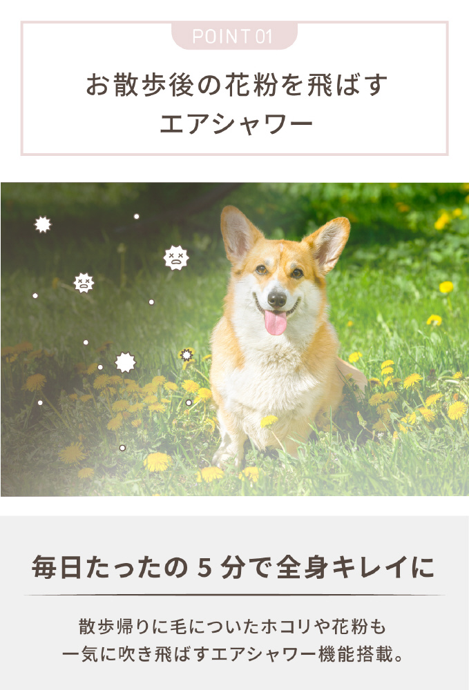 散歩帰りに毛についたホコリや花粉も一気に吹き飛ばすエアシャワー機能搭載。
