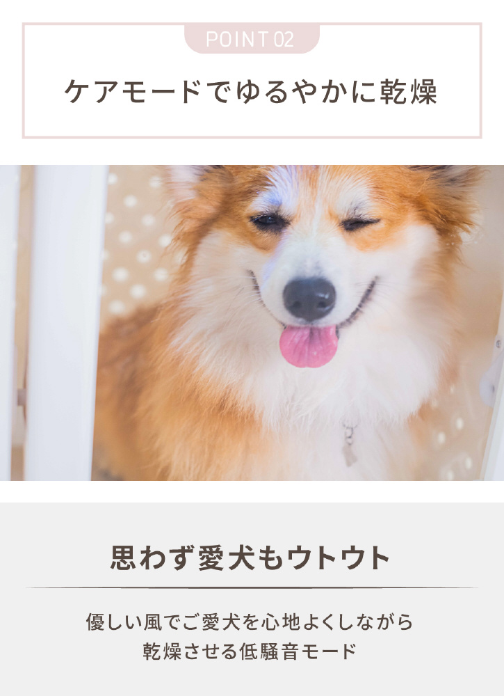 優しい風でご愛犬を心地よくしながらかんそうさせる低騒音モード