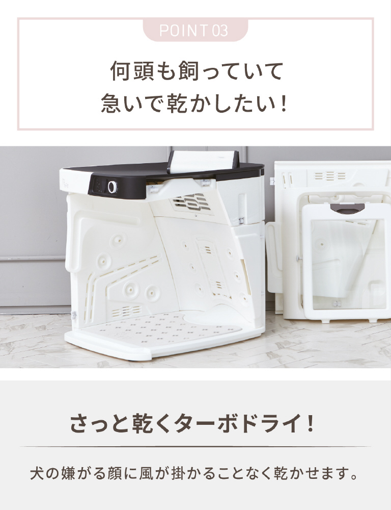 犬の嫌がる顔に風が掛かることなく乾かせます。