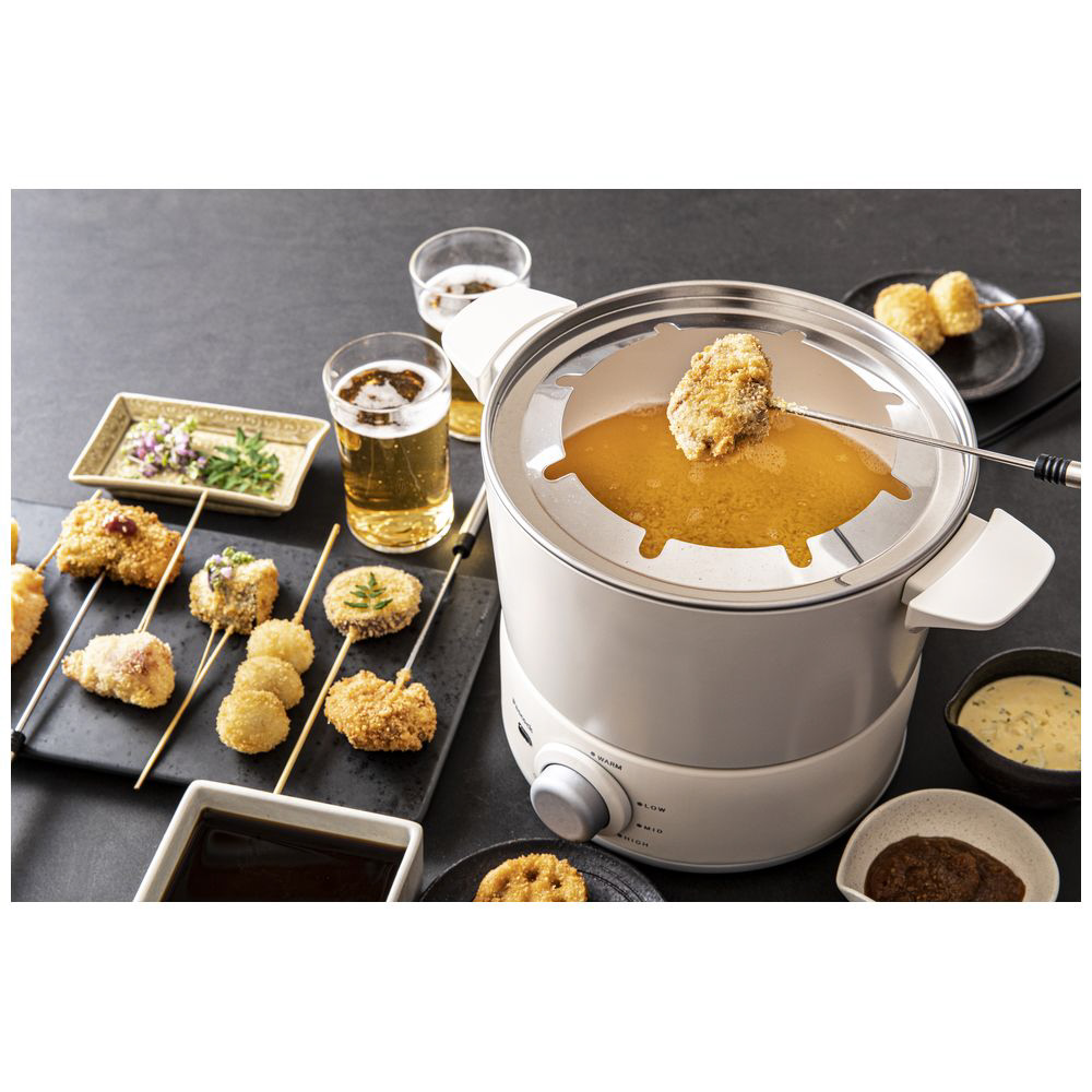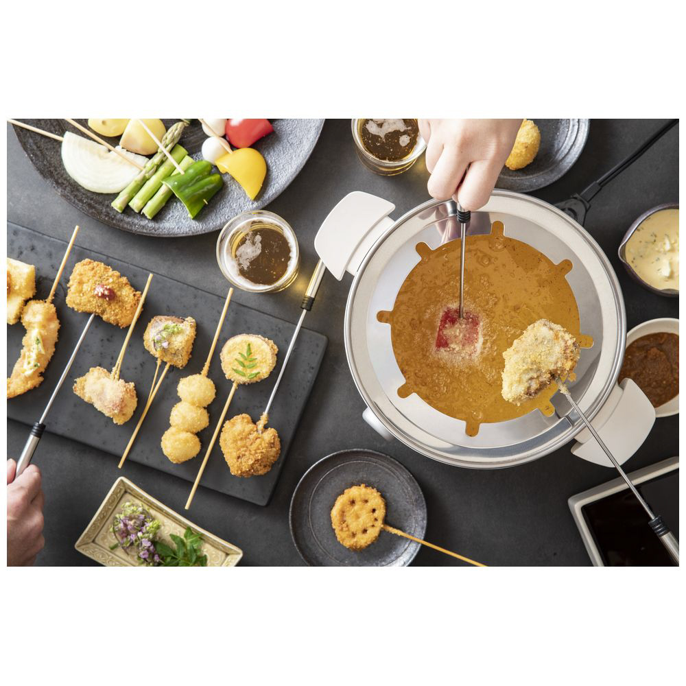 家族や友達と、美味しい串揚げを食卓で楽しめるフライヤー。深型で油跳ねしにくく、鍋としても使用可能です。
