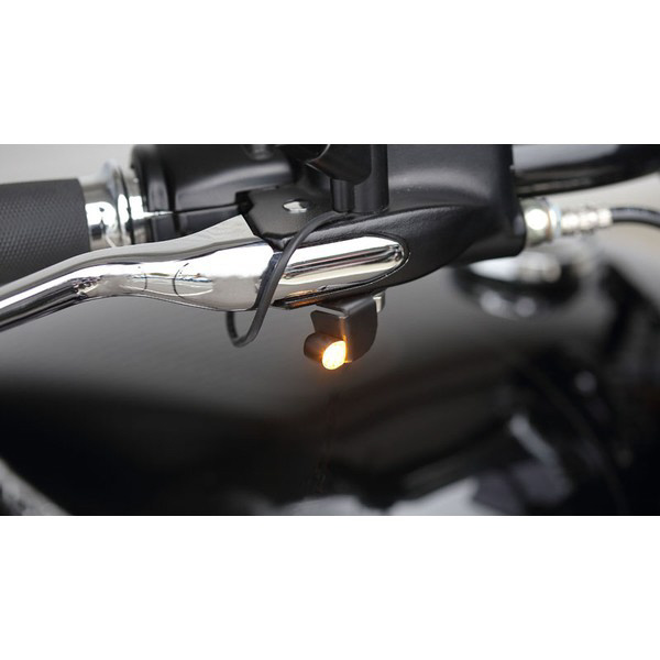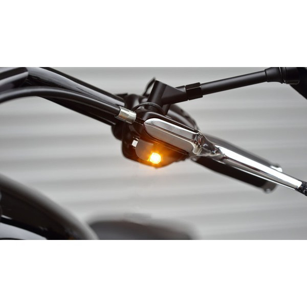 ボディーサイズ 9.8×9.8×14.2mmの極小LEDウインカーランプとハーレーダビッドソンのミラーボルトを利用して装着する為のステーをセットにした商品です。