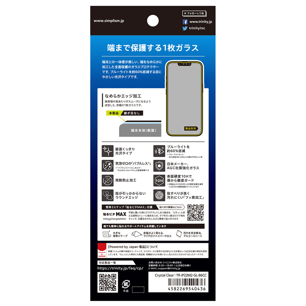 端末との一体感が美しい、端をなめらかに加工した全面保護のガラスプロテクター。ブルーライトを約60%低減する目にやさしい光沢タイプ。