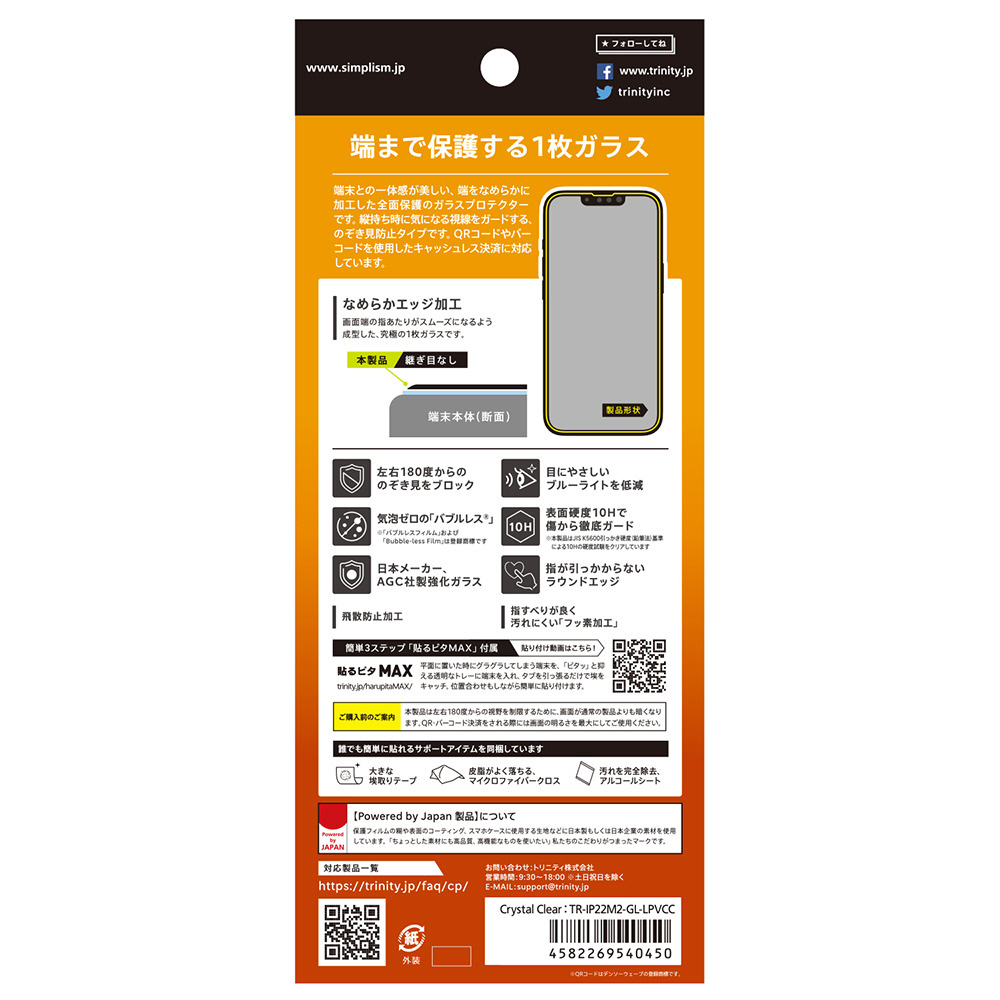 端末との一体感が美しい、端をなめらかに加工した全面保護のガラスプロテクター。縦持ち時に気になる視線をガードする、のぞき見防止タイプ。
