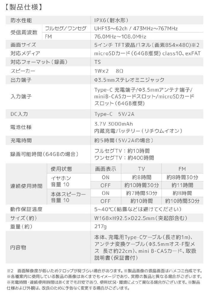 仕様2 【受信周波数】テレビ:UHF13〜62ch 473MHz〜767MHz FMラジオ:76.0MHz〜108.0MHz