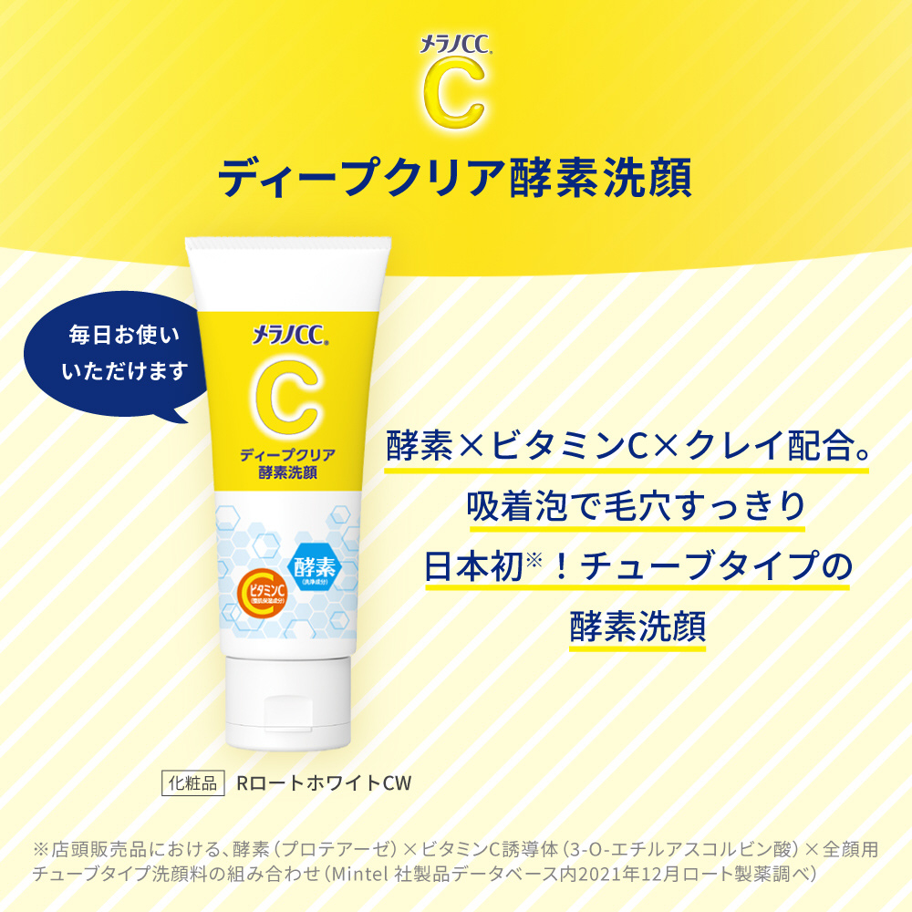 「メラノCC ディープクリア酵素洗顔」は、毎日の毛穴ケアにおすすめの酵素(プロテアーゼ:洗浄成分)×ビタミンC(アスコルビン酸:整肌保湿成分)配合の洗顔フォーム。