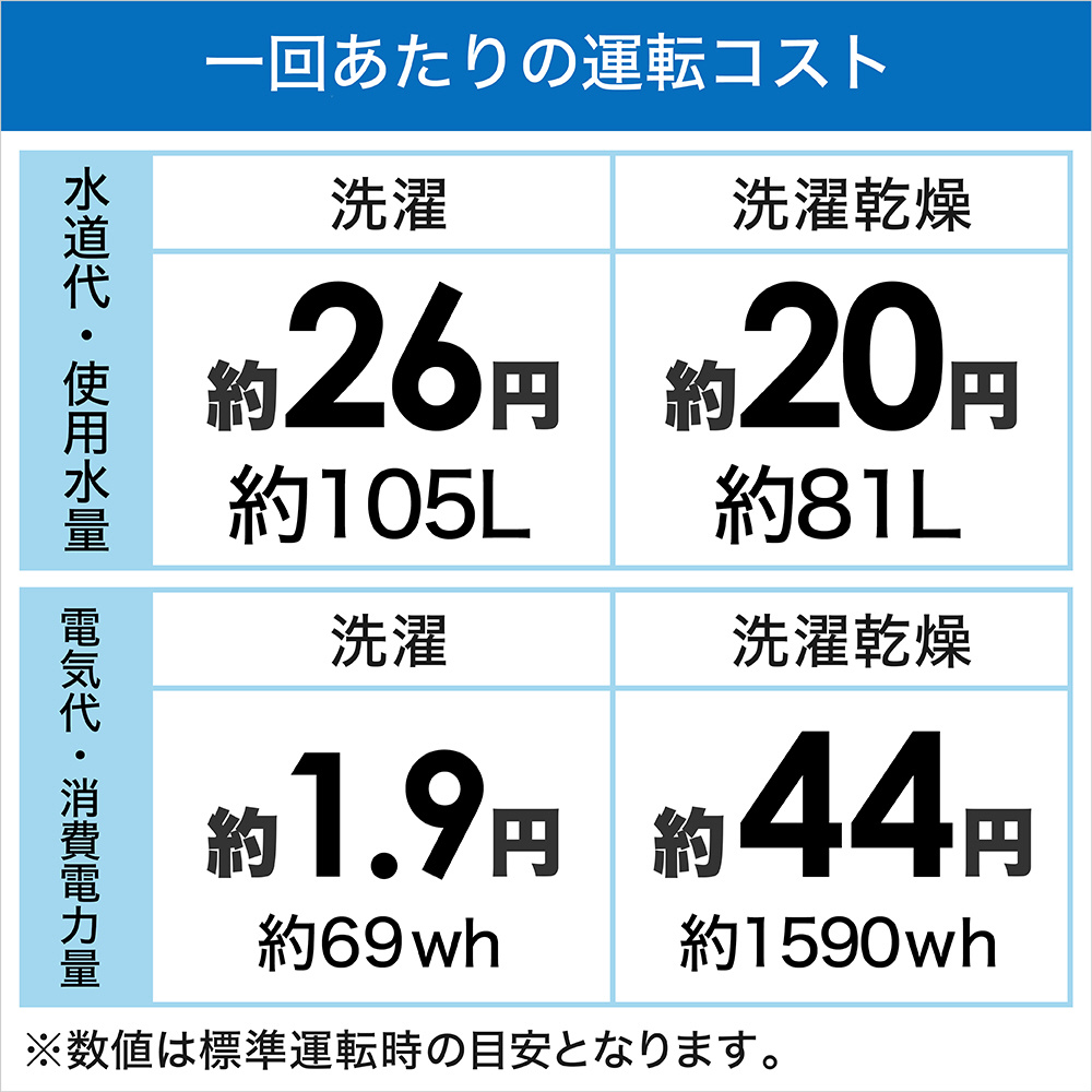 | 標準使用水量[洗濯〜乾燥時] | 約81L |