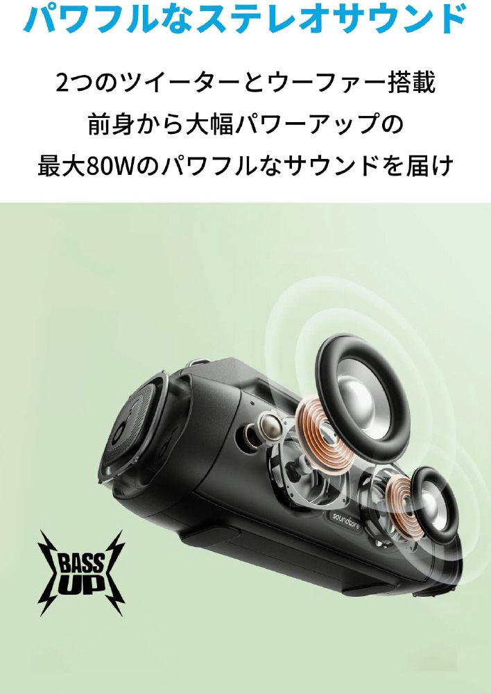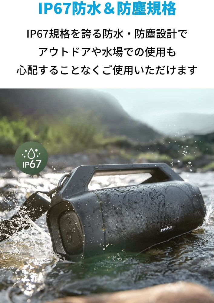 最大80Wのパワフルなサウンドを実現。 IP67の防水&防塵規格に対応したアウトドアでの使用にぴったりなBluetoothスピーカー