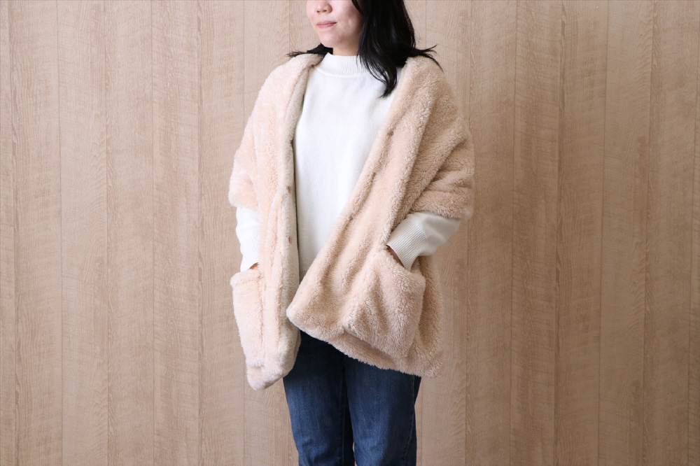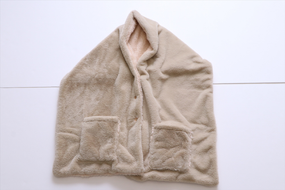 ブランケットとして使えて、肩から掛けても動きやすいボタン付きです。