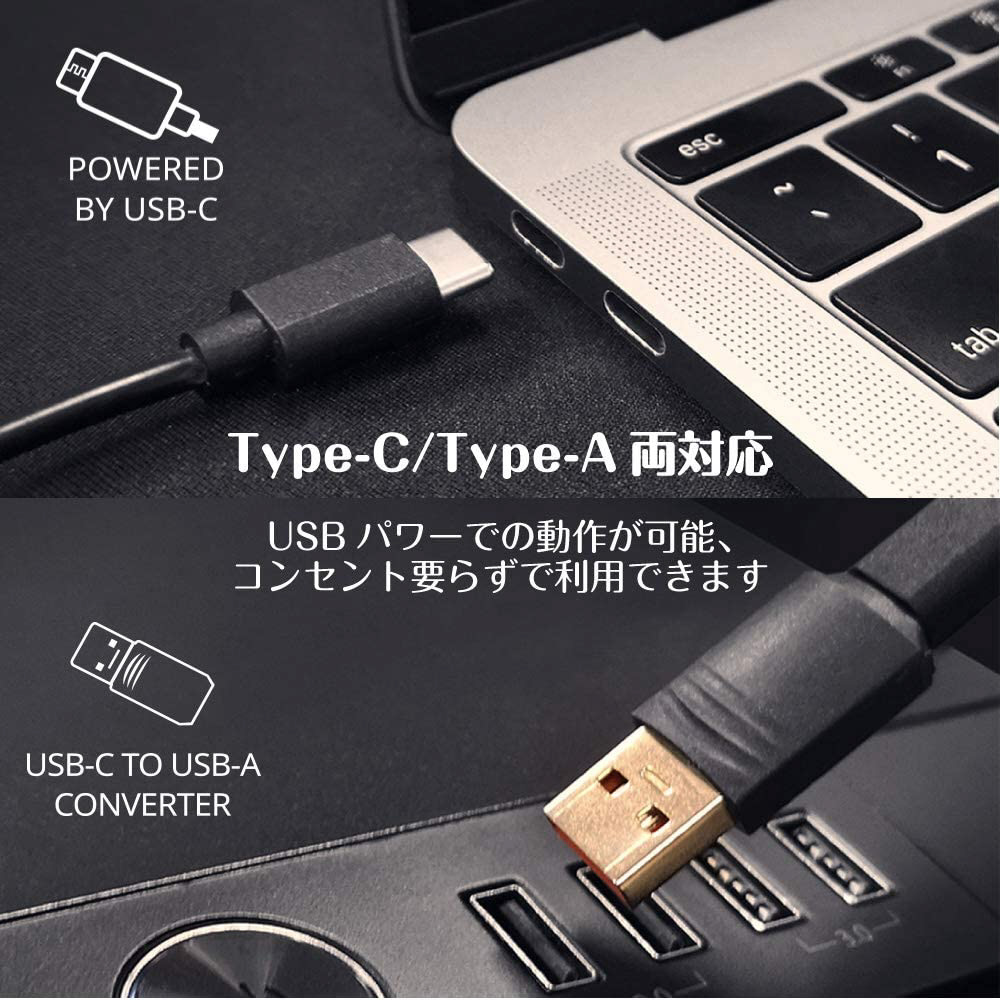電源ケーブルをノートパソコンのUSB Type-Cポートに接続してUSB電源で動作が可能なほか、USB C-A変換アダプターも同梱しており、デスクトップパソコンなどのUSB Type-Aポートにも接続可能。