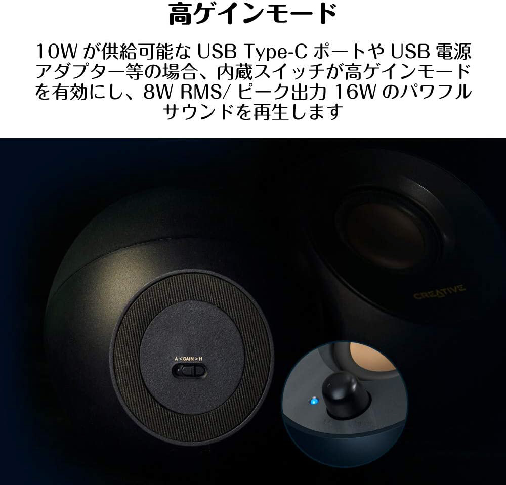 10Wが供給可能なUSB Type-CポートやUSB電源アダプター等に接続した場合は、Pebble V2に内蔵のゲインスイッチが高ゲインモードを有効にし、8W RMS(ピーク出力16W)のパワフルサウンドを再生します。