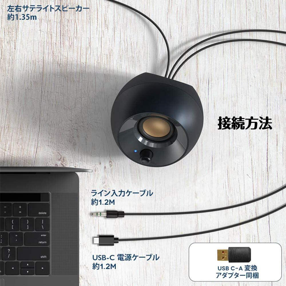 ・スピーカー本体(左サテライト・右サテライト、スピーカーケーブル 約1.35mスピーカー間/ライン入力ケーブル 約1.2m/電源用USBケーブル 約1.2m付属)(ケーブル取り外し不可)