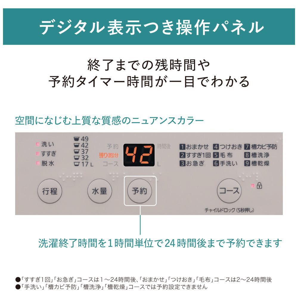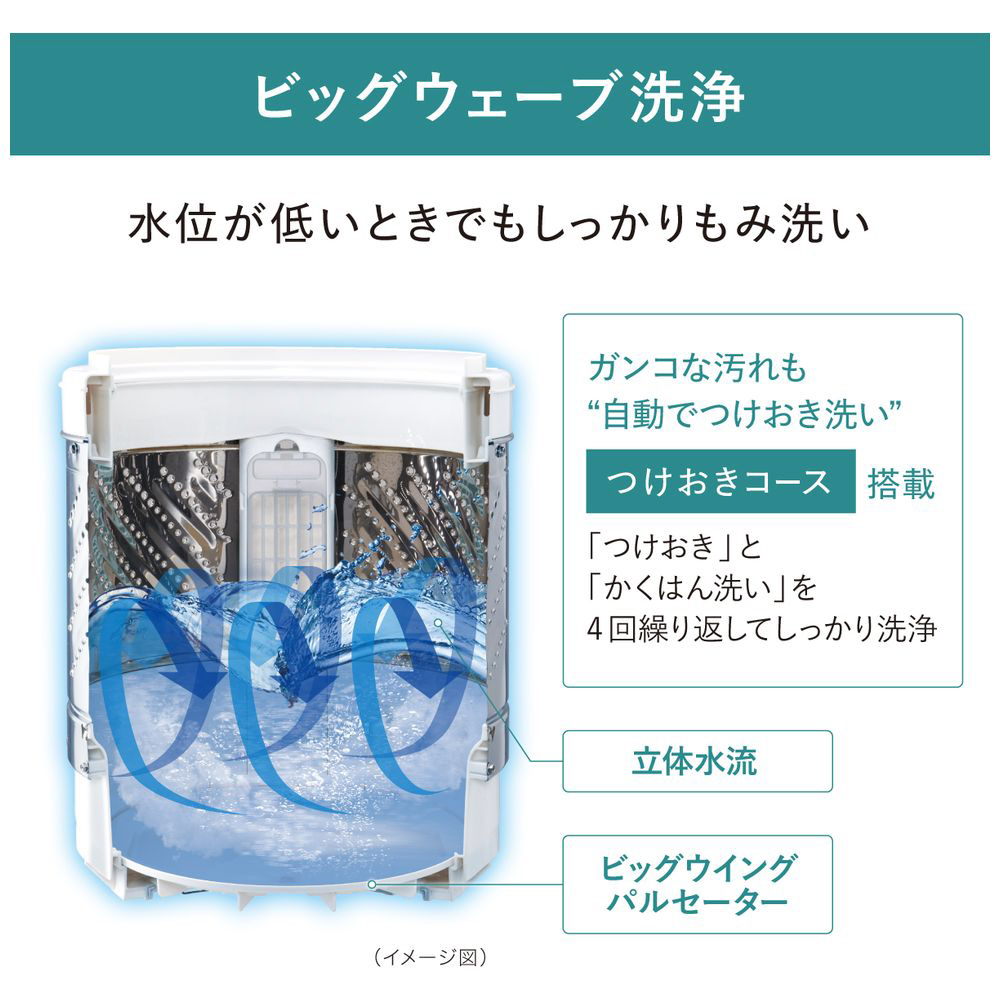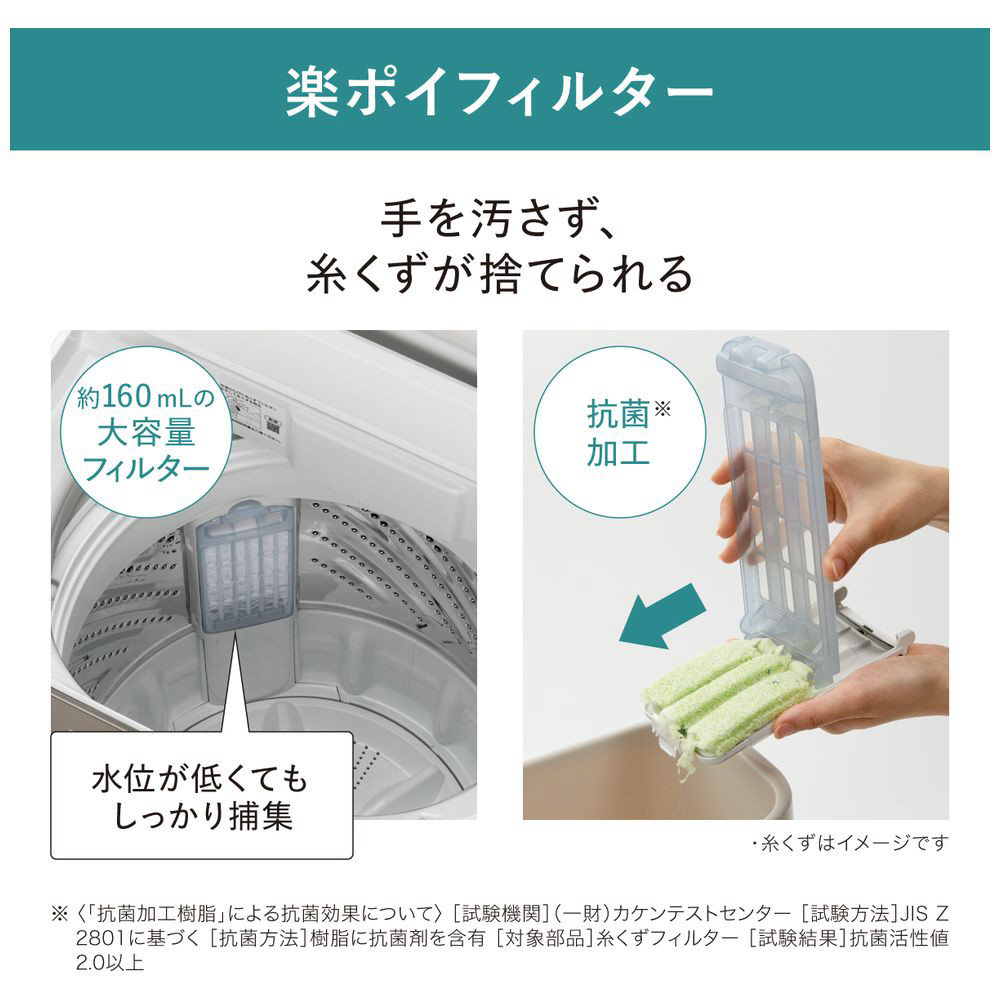 高い洗浄力でしっかり洗浄。「楽ポイフィルター」で、お手入れが簡単・清潔。槽乾燥で黒カビを抑制。