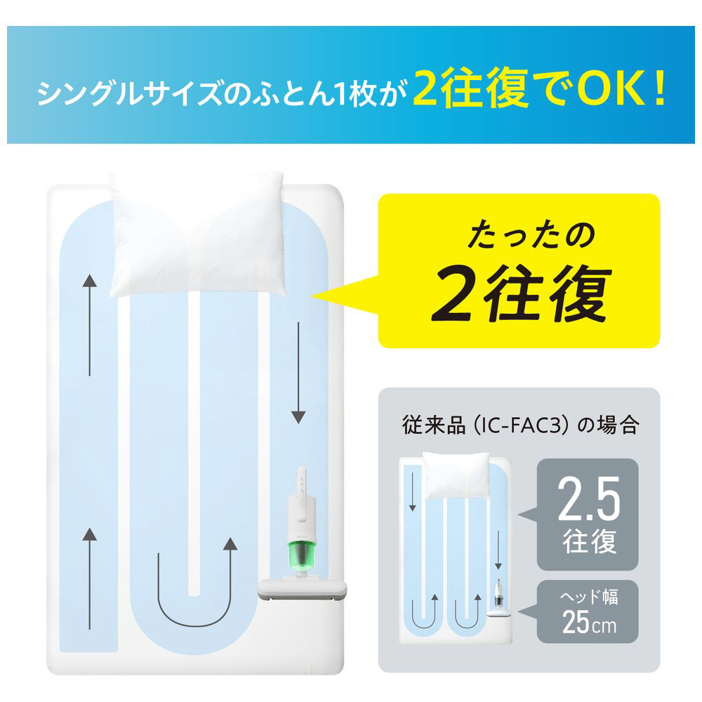 強力にゴミをかきとるパワーヘッドで吸引力がさらにアップ、約30cmのワイドヘッドでお掃除がはかどるACふとんクリーナーハイパワーです。
