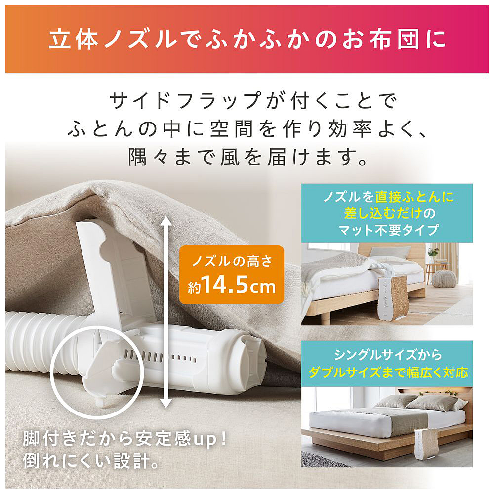 ■よりロングになった立体フラップにより大きな空間ができ、更に左右フラップで倒れにくくなったので、ふとんの隅々まで温風が行き届きます。