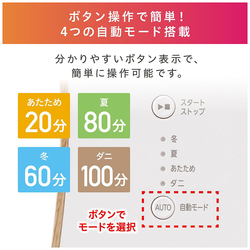 ■自動4モード(冬・夏・あたため・ダニ)、手動モード搭載で、1年中使用できます。