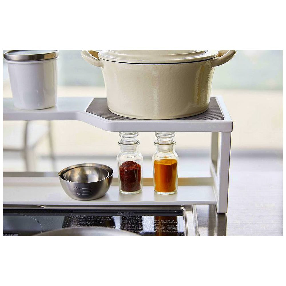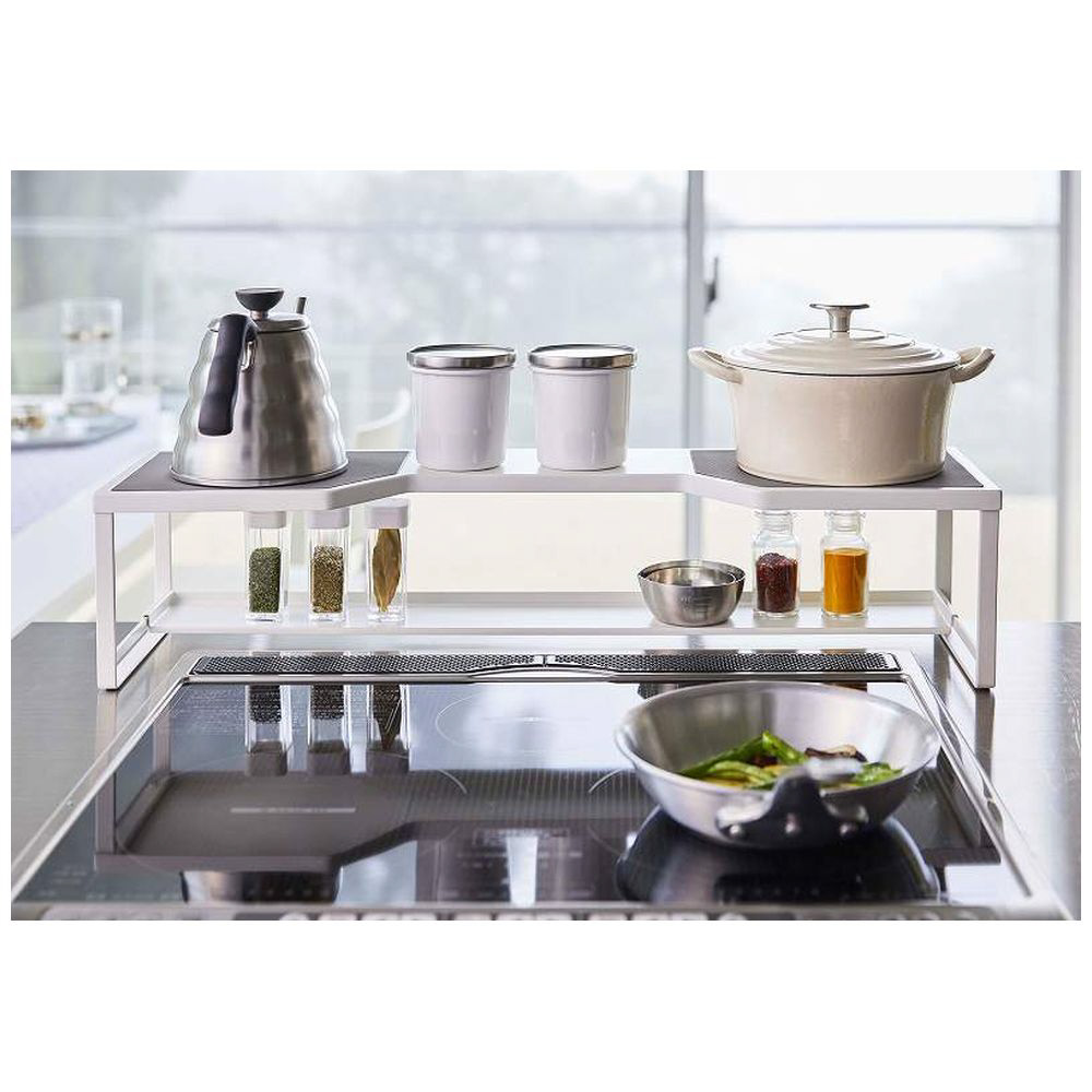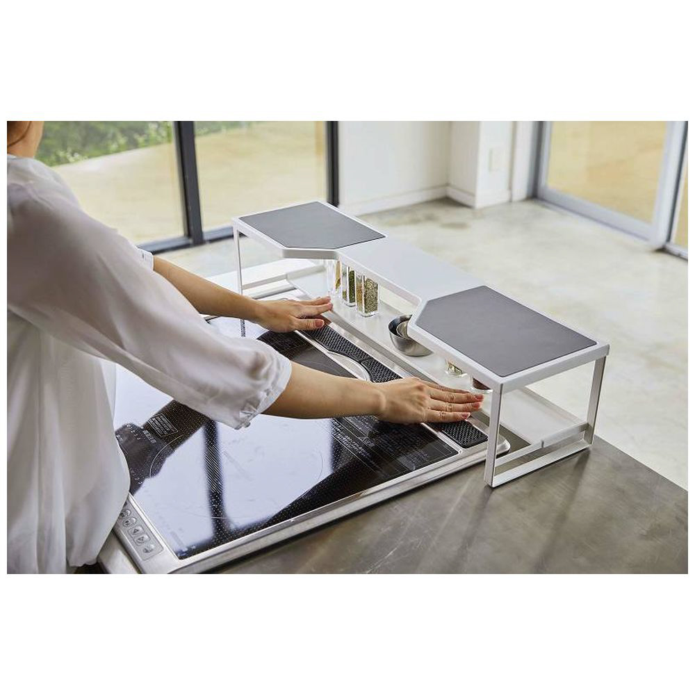 小物が置ける排気口カバーと、コンロ奥ラックが一体になった排気口カバー付きコンロ奥ラック。 脚部にはシリコンクッションが付いているから、キッチンをキズつけません。