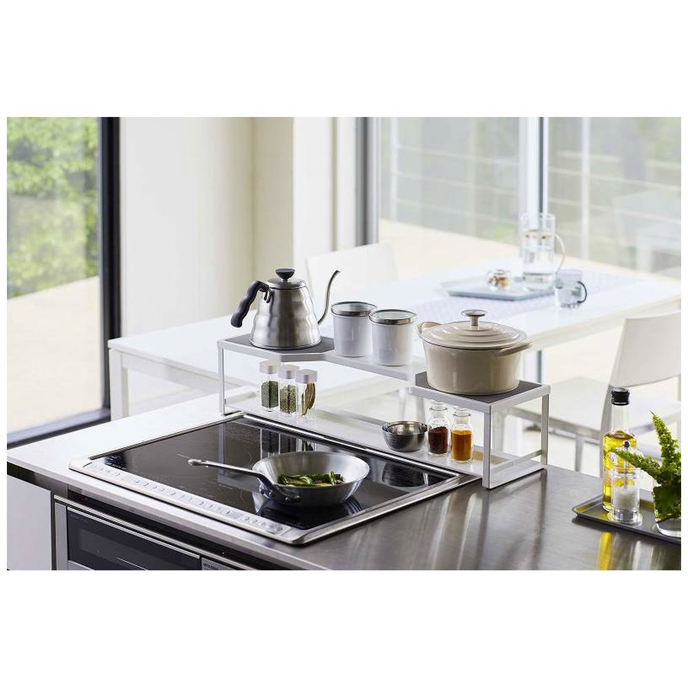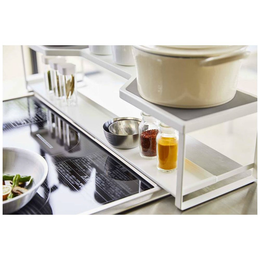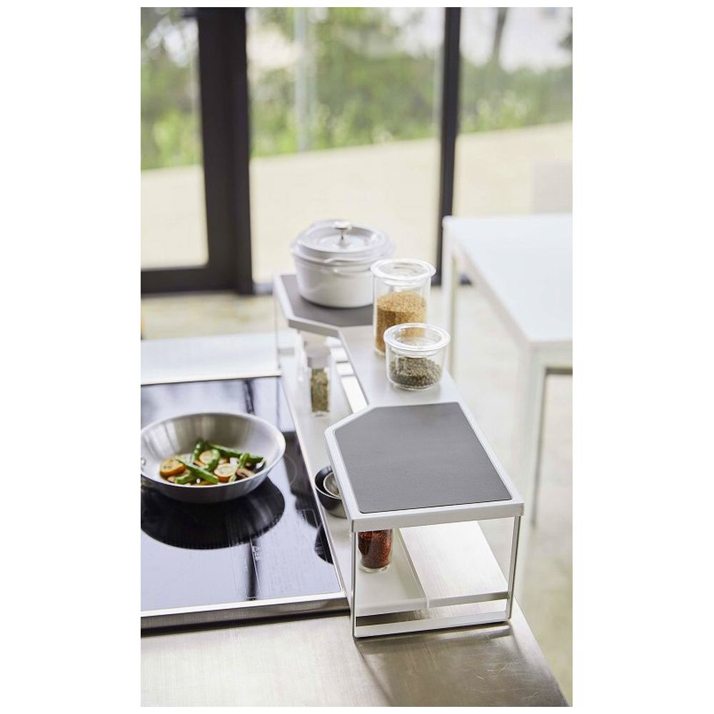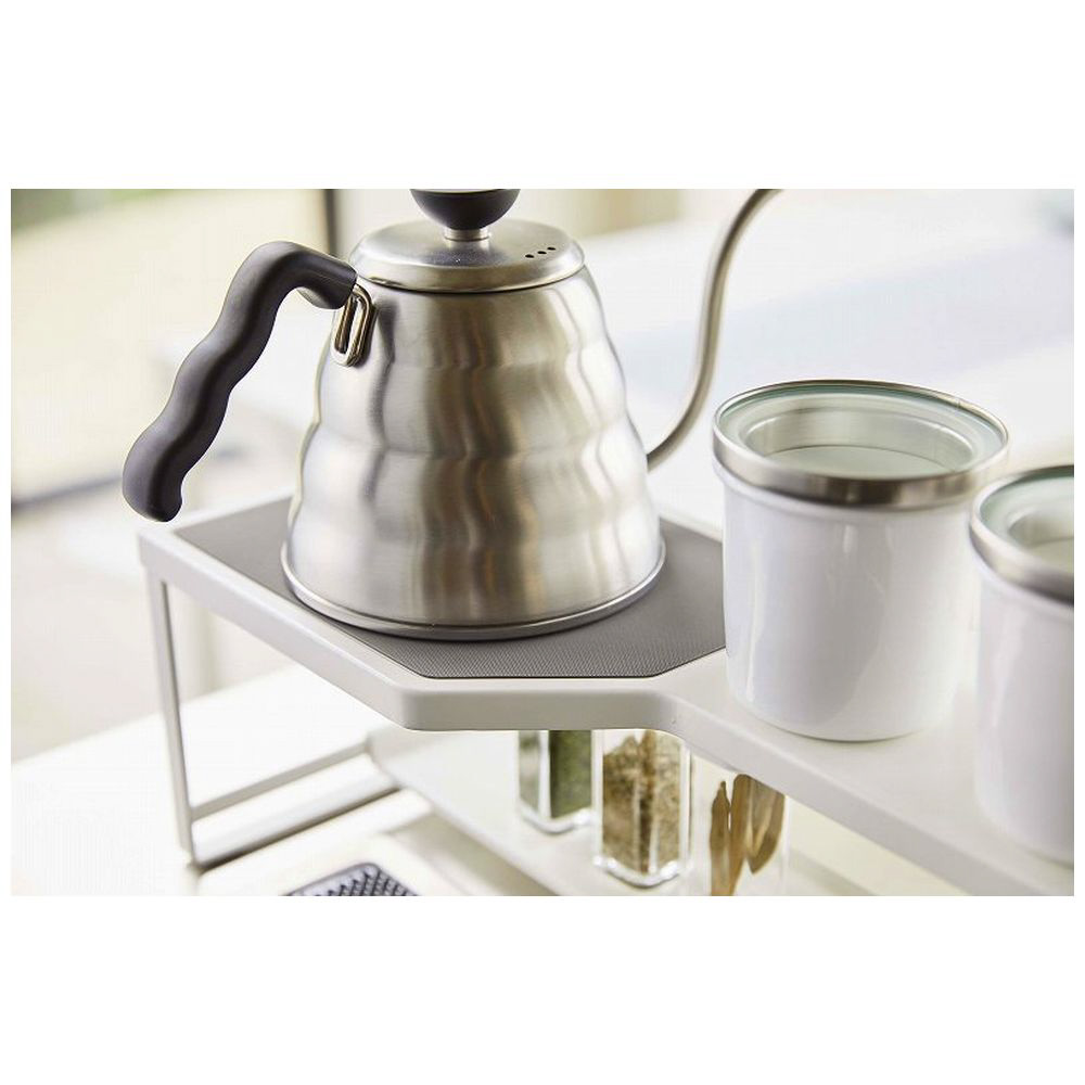 小物が置ける排気口カバーと、コンロ奥ラックが一体になった排気口カバー付きコンロ奥ラック。 脚部にはシリコンクッションが付いているから、キッチンをキズつけません。