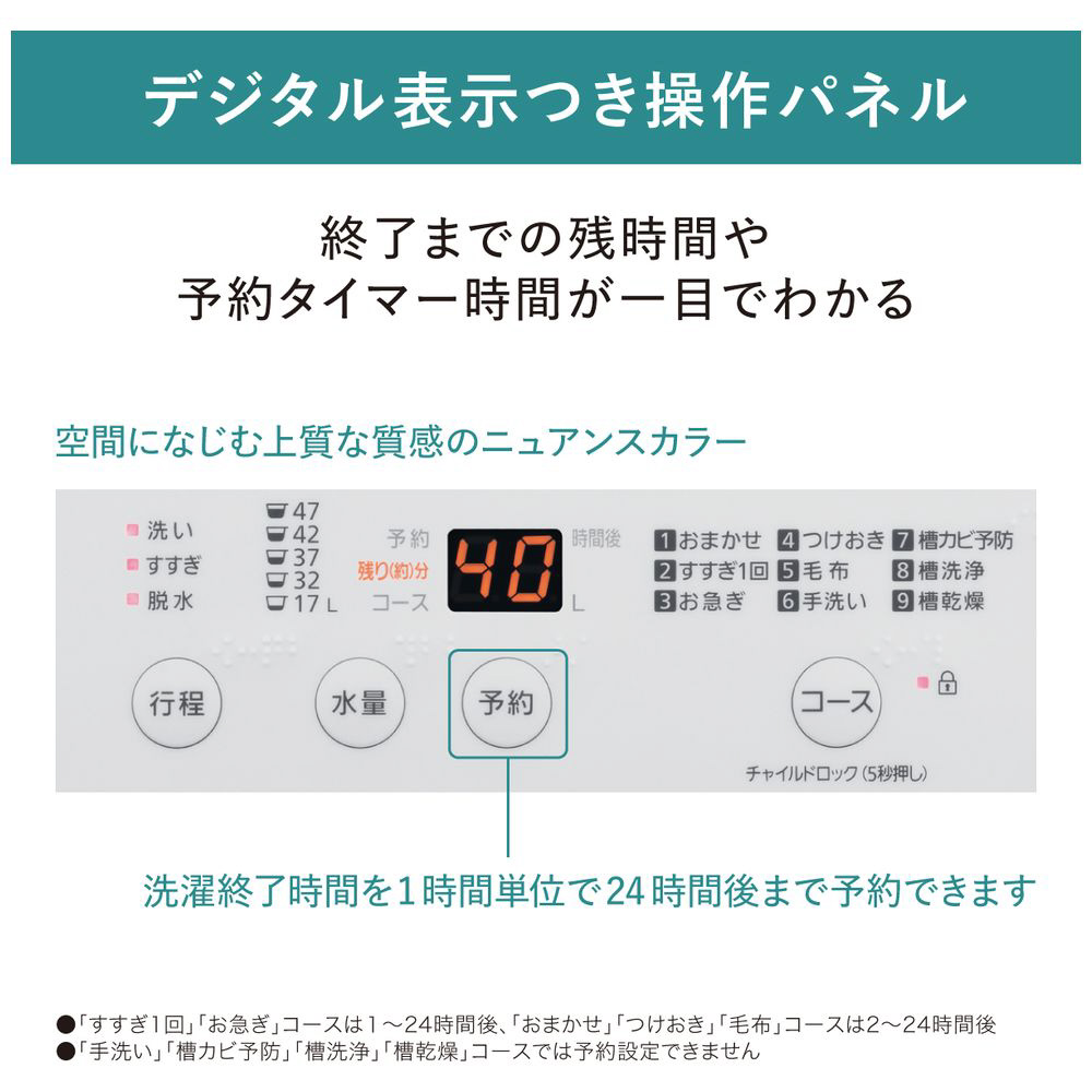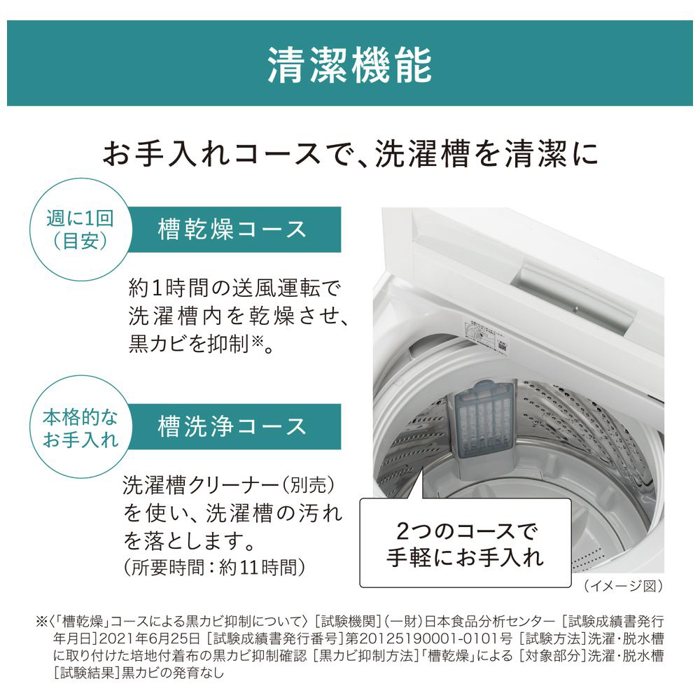 高い洗浄力でしっかり洗浄。「楽ポイフィルター」で、お手入れが簡単・清潔。槽乾燥で黒カビを抑制。水位が低いときでも、しっかりもみ洗い「ビッグウェーブ洗浄」を搭載。