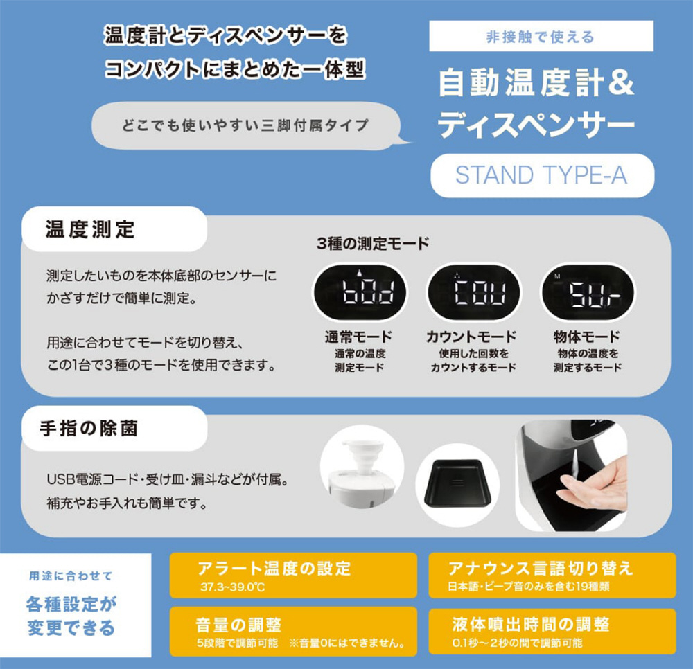 温度計とディスペンサーをコンパクトにまとめた一体型のスタンドタイプの製品です。温度の測定とアルコール噴霧を同時に行う事ができます。受け皿や漏斗などが付属している為、補充やお手入れも簡単に行えます。三脚が付属しているので場所を選ばず設置可能です。工具やネジを使う事なく、三脚用パーツを取り付けるだけで簡単に設置可能です。USB給電(TypeC)か単3アルカリ乾電池を4本(別売)使用します。通常の温度測定モードの他に、使用した回数をカウントするモード、物体の温度を測定するモードなどを切り替えられます。