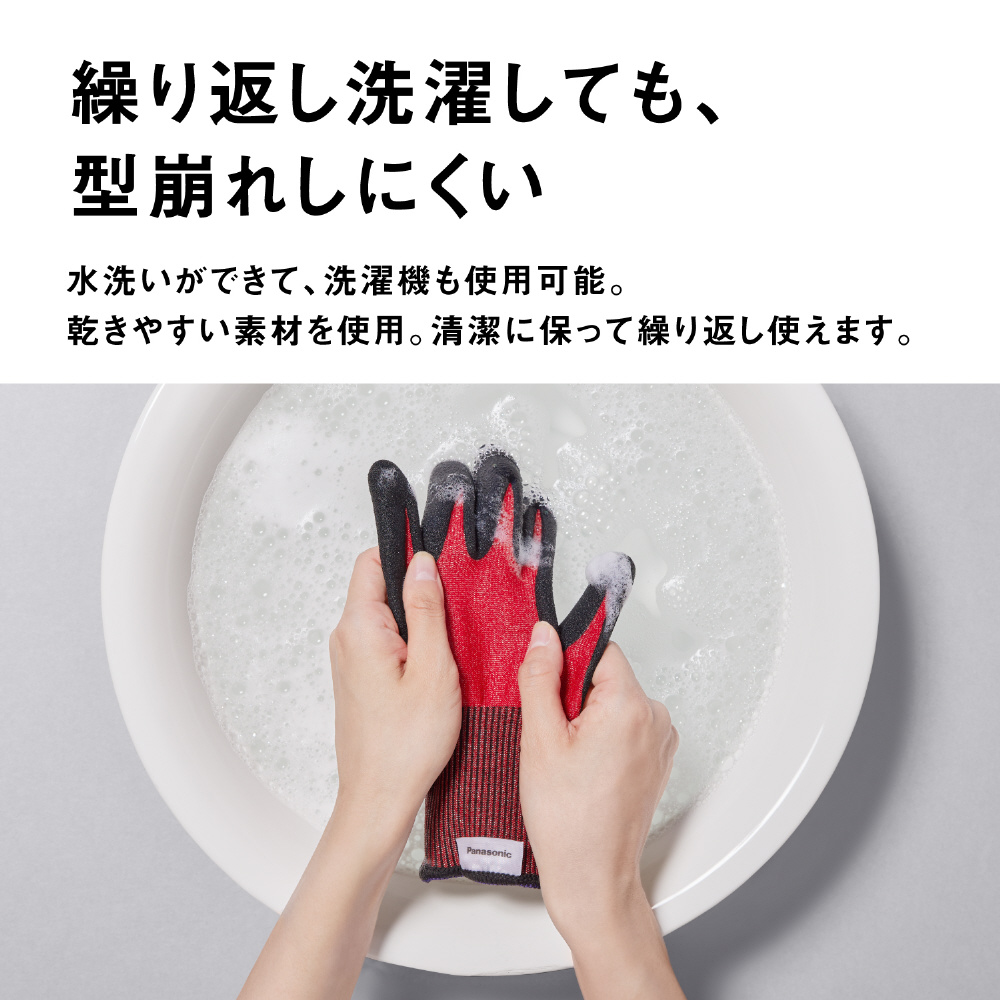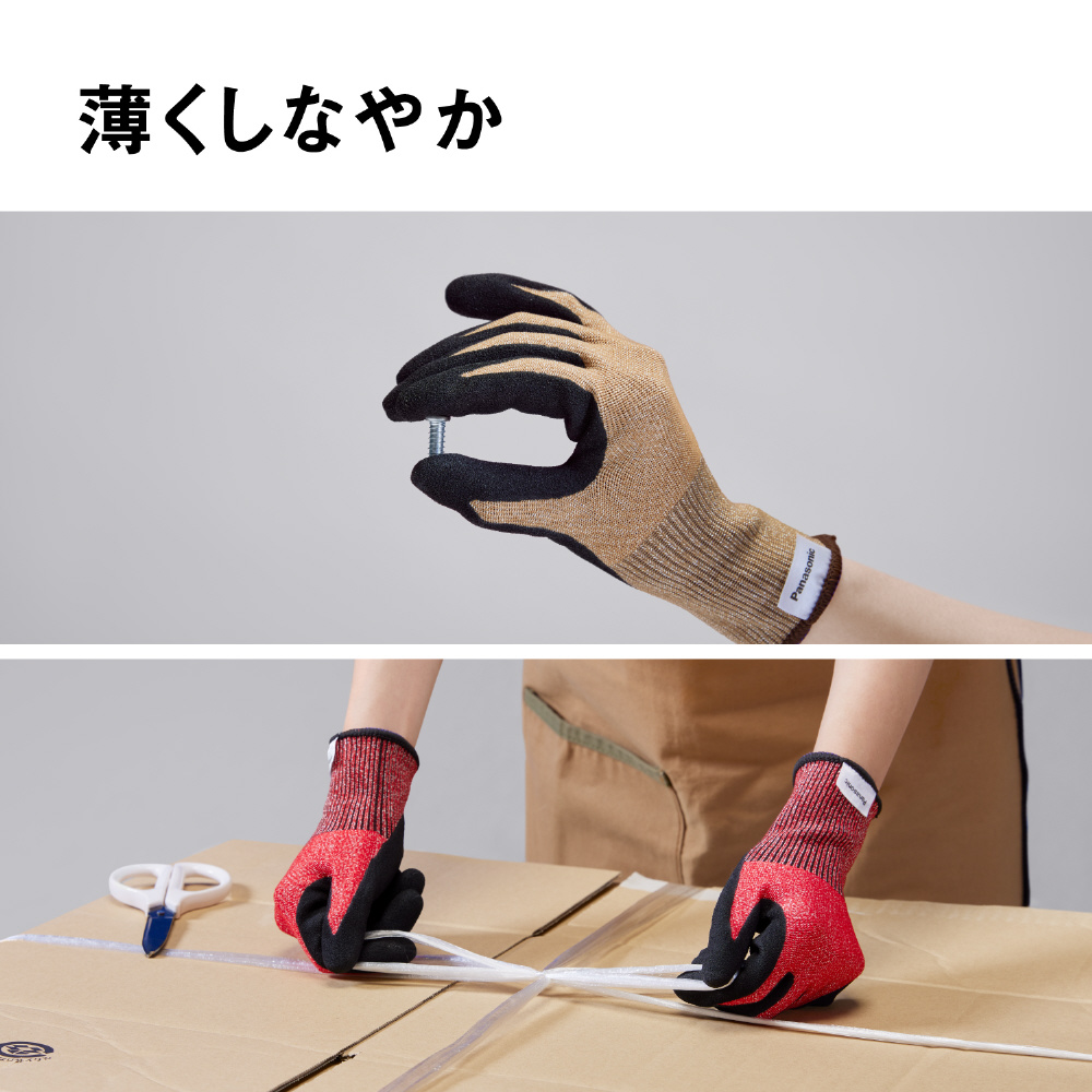 パナソニックがあかり事業で培ってきたタングステン線加工技術を応用。耐切創性と柔軟性を兼ね備え、一般的な手袋のような感で使用できます。