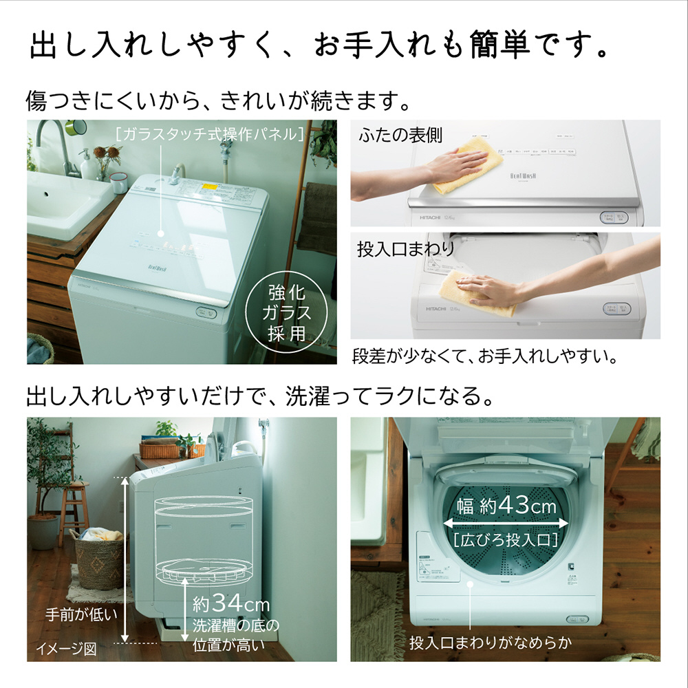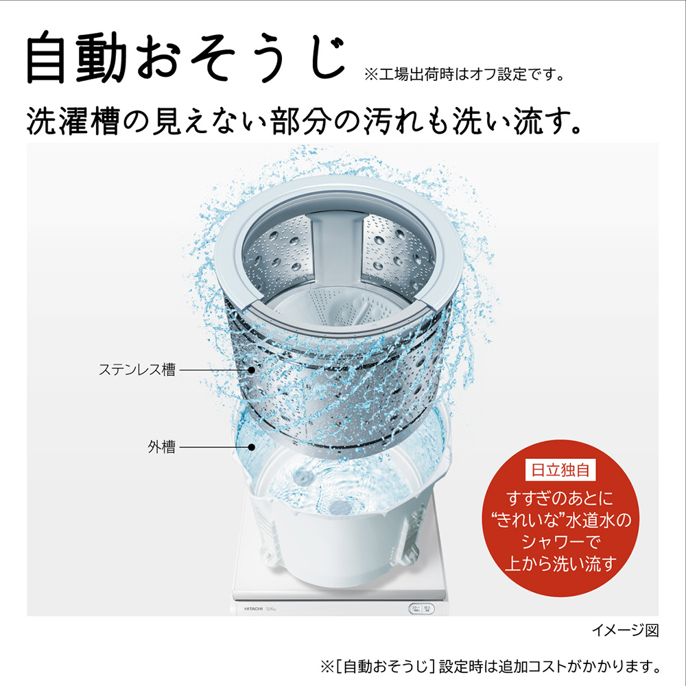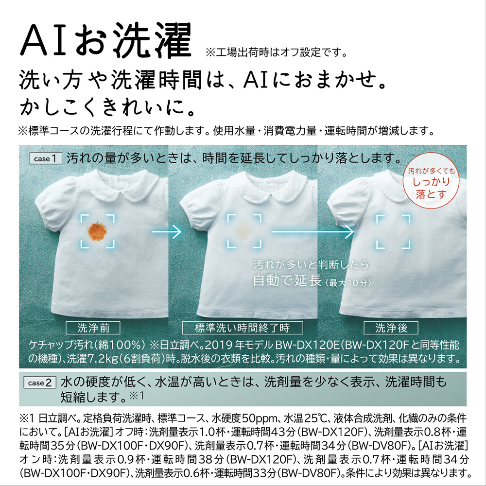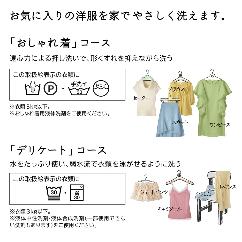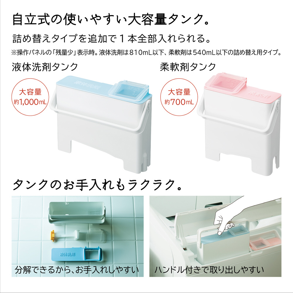自動で適量投入「液体洗剤・柔軟剤自動投入」。「AIお洗濯」でかしこくきれいに洗う。黄ばみの除去に「[温水]ナイアガラビート洗浄」。