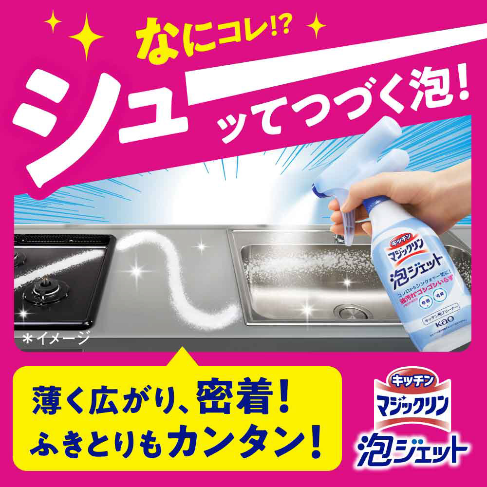 コンロからシンクまで!シューーーーッてつづく泡が、薄く広がり、密着。毎日の油汚れゴシゴシいらず!