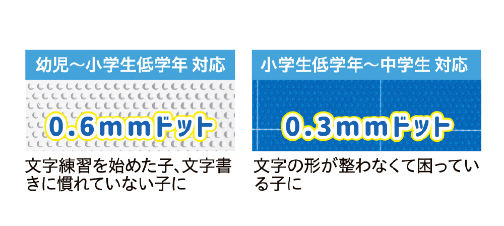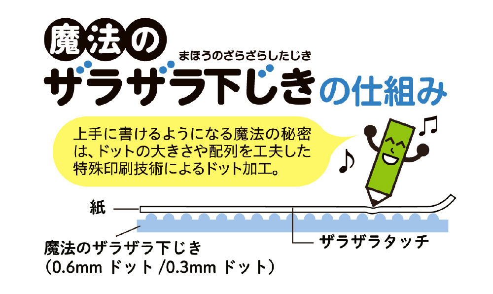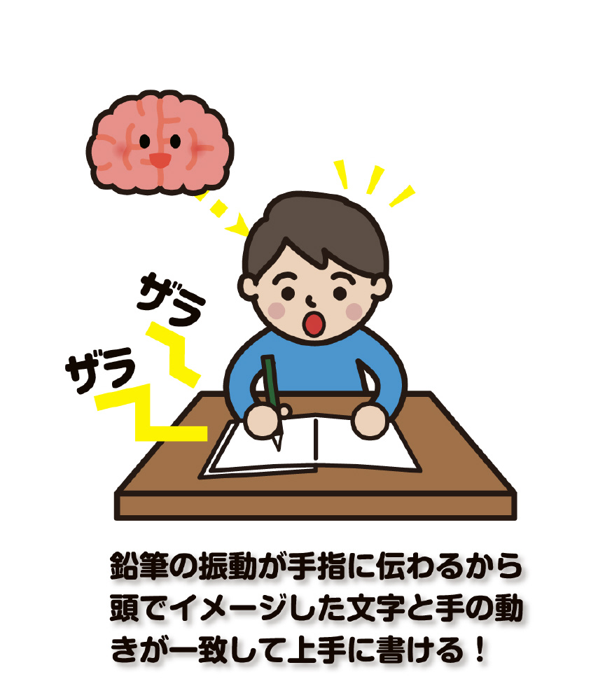 ●表面に施した細かいドット加工が、筆記時、鉛筆の動きが振動となってザラザラと手や指に伝わることで、頭の中にイメージした文字と手の動きが一致しやすくなります。