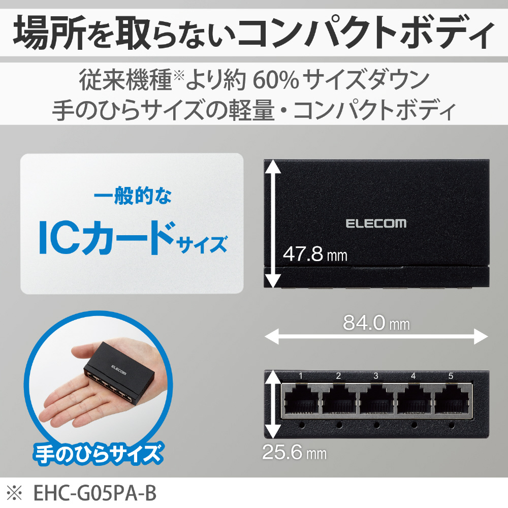 従来機種(EHC-G05PA-B)より容積比で約60%コンパクト。1000BASE-T対応ACアダプター電源のメタル筐体5ポートスイッチングハブです。
