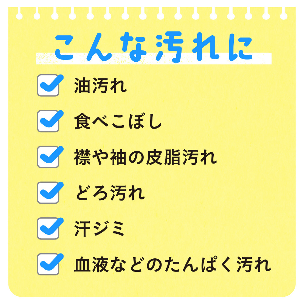 5種(皮脂・油、食べこぼし、飲みこぼし、血液、泥)の汚れにこれ1本。