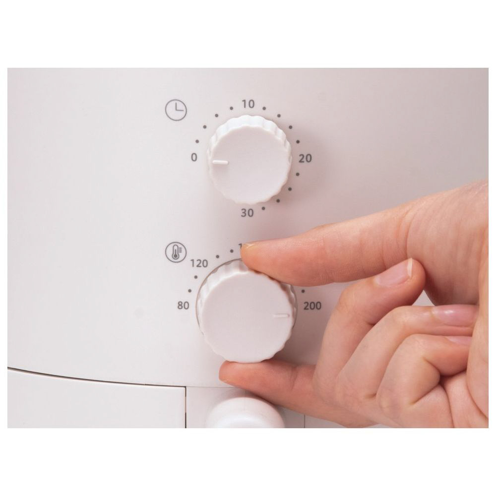 ダイヤル式の温度調節・タイマー設定。バスケットの水洗いOK、レシピブック付属。700W、タイマー30分、温度調節80〜200℃。油ハネや揚げ油の片付けも心配なし!手軽に揚げ物が楽しめる