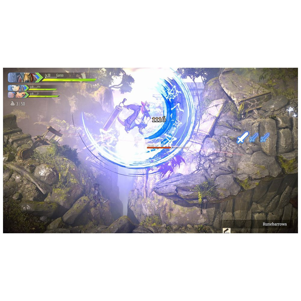 『百英雄伝 Rising』は“アクションゲーム”に不慣れなユーザーも、CJ、ガルー、そしてイーシャという3人のプレイキャラをサクサク切り替えて、爽快なアクションプレイが楽しめるシステムを採用しています。各キャラクターの特技を組み合わせたコンボ攻撃「リンクアタック」を繰り出すのも超カンタン!ぜひお楽しみください。