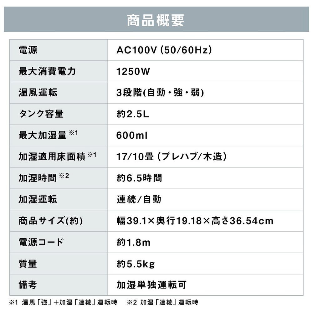 | 消費電力 | [温風のみ] 強:1250W、弱:625W [加湿運転時] 温風「強」+加湿「連続」:1200W 温風「弱」+加湿「連続」:680W 加湿「連続」:670W |