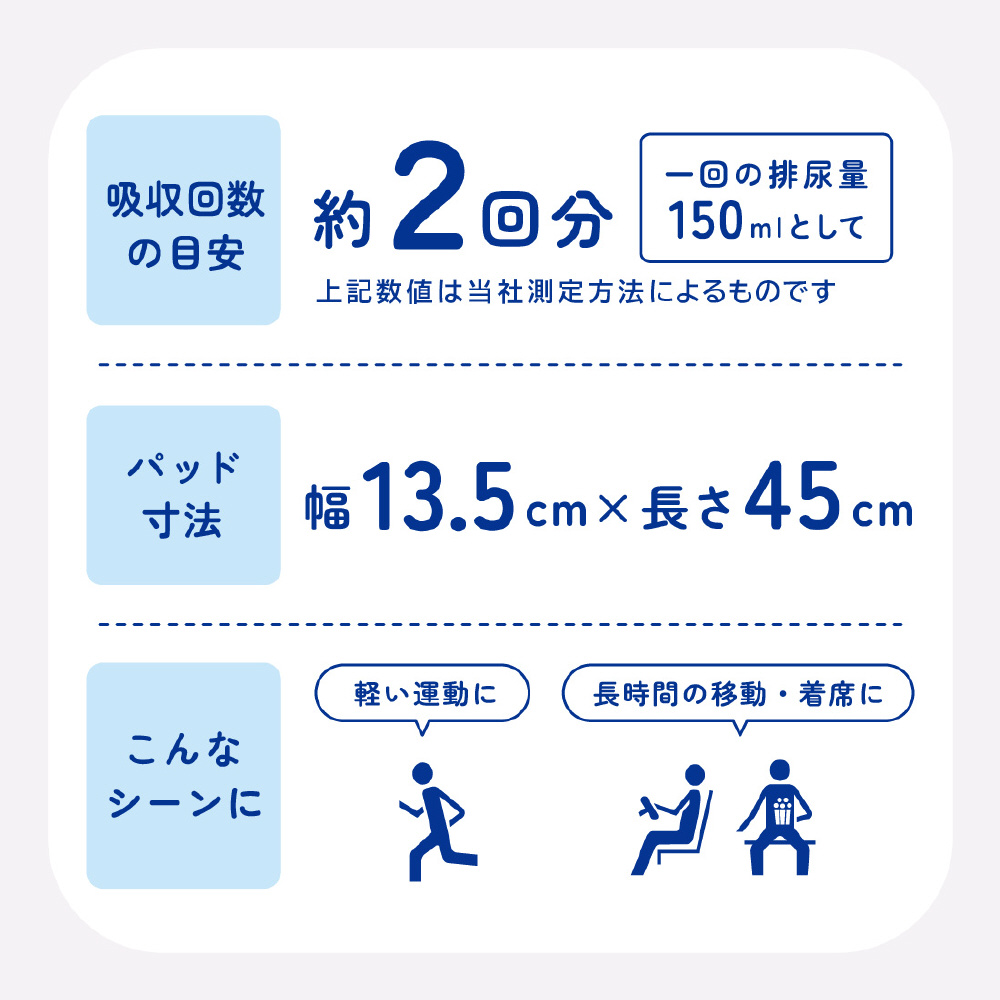 | 仕様1 | 素材 表面材:ポリオレフィン系不織布 吸水材:綿状パルプ、吸収紙、高分子吸水材 防水材:ポリエチレンフィルム 伸縮材:ポリウレタン、ポリオレフィン系エラストマー 結合材:スチレン系エラストマー合成樹脂材 |