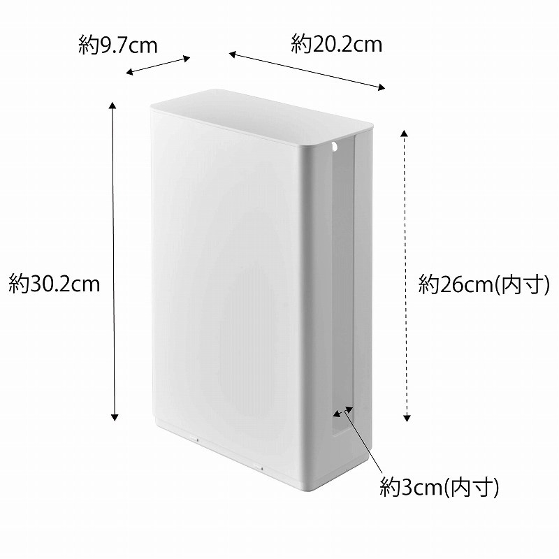 | 仕様1 | サイズ:約9.7×D20.2×H30.2cm(蓋含む) (内寸:収納部=約W8.8×D19×H28.5cm、スリット穴=約3c×H26cm) |