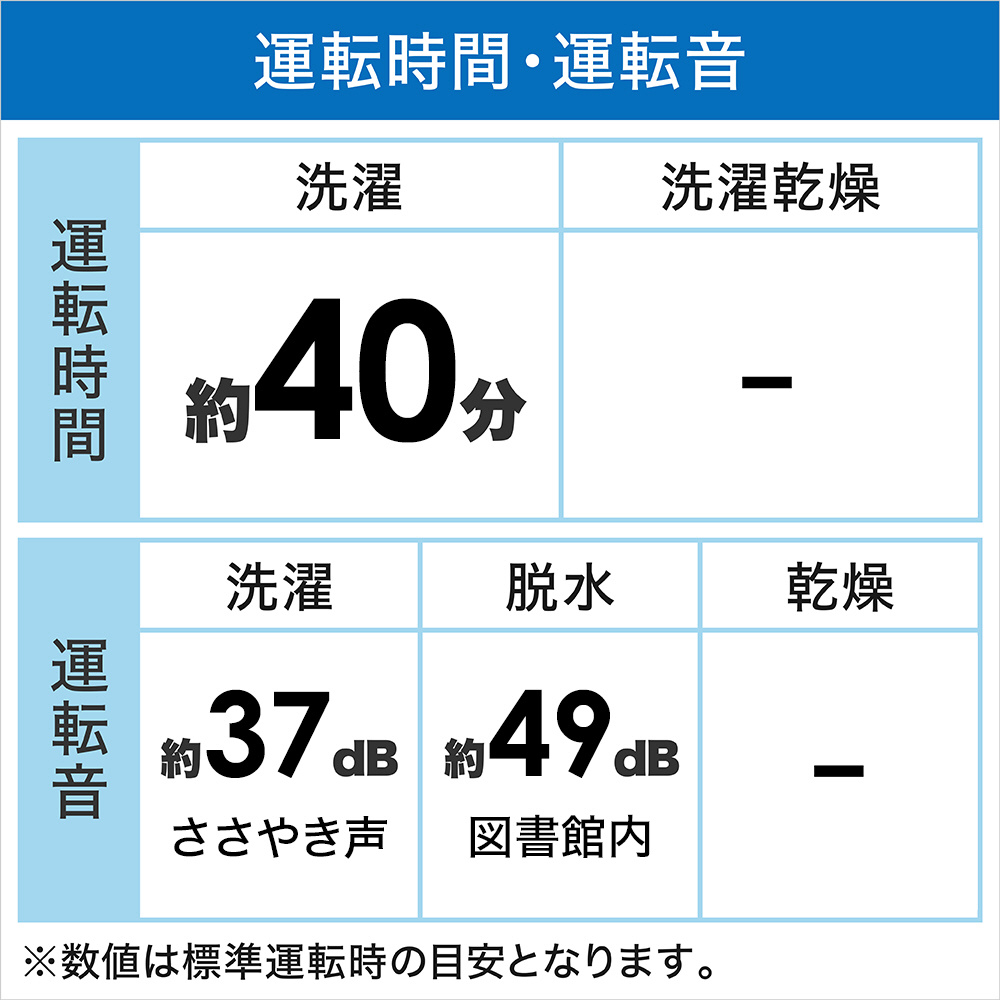 | 運転時間[洗濯時] | 約40/36分(50/60Hz) |