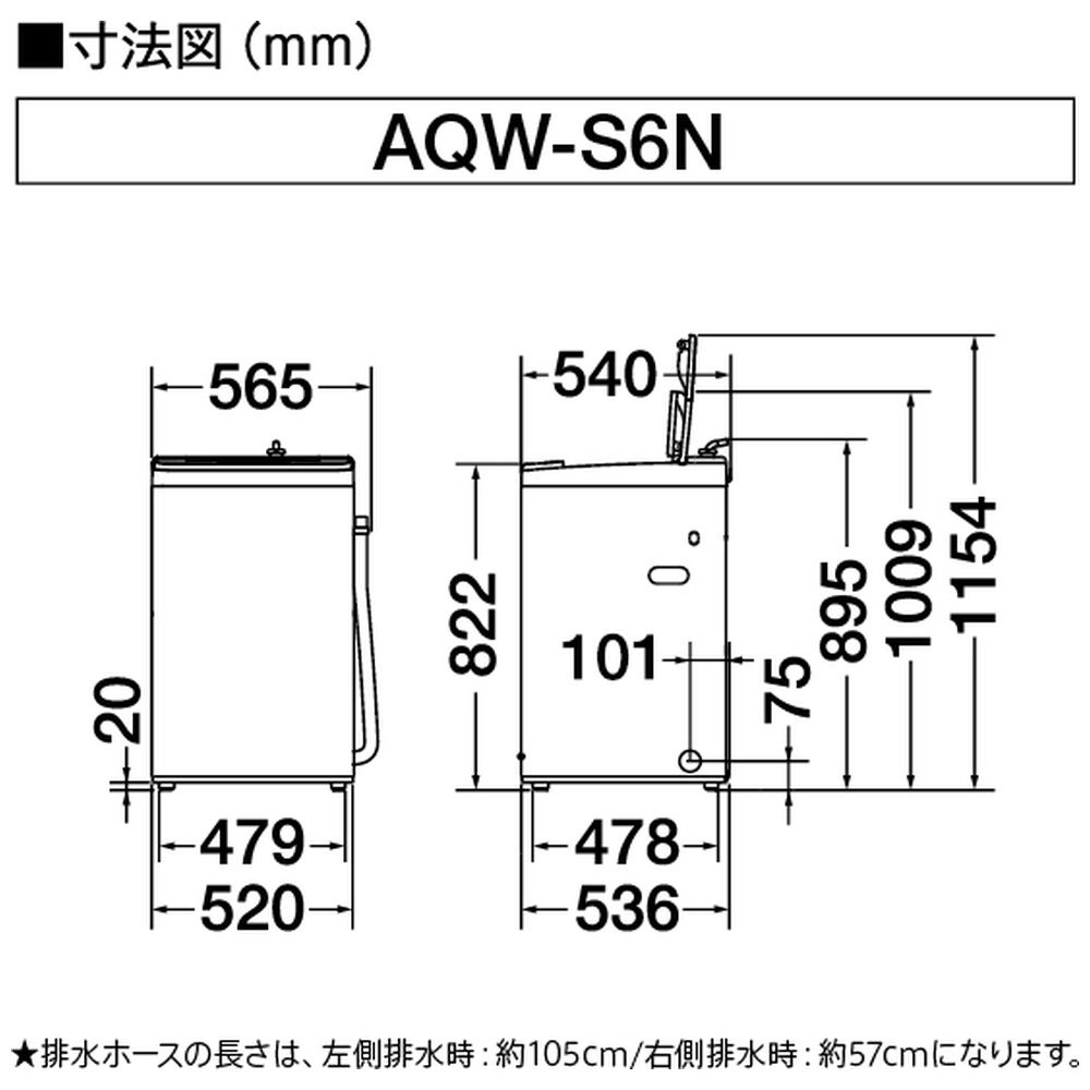 | 商品名 | 全自動洗濯機6kg ホワイト AQW-S6N(W) [洗濯6.0kg /上開き] |