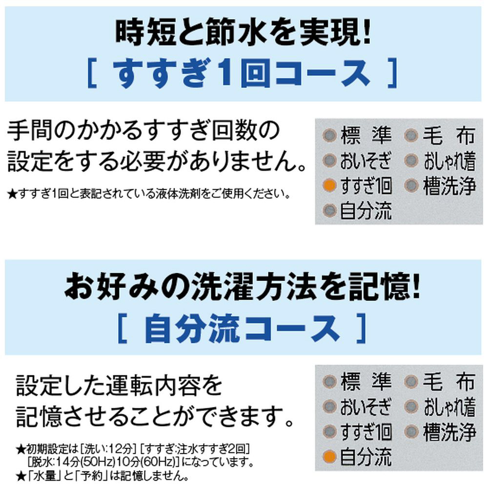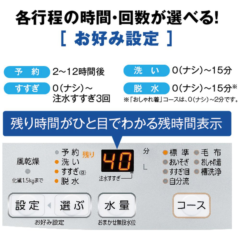 予約運転の設定や、洗い時間・すすぎ回数・脱水時間をお好みで選べるので、汚れ具合や洗濯物に合わせた「お好み」の洗い方が設定できます。