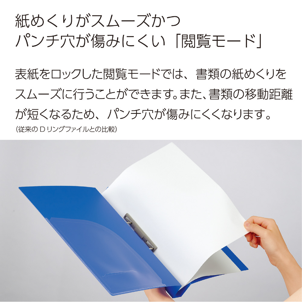 ●閲覧モード/表紙をロックした閲覧モードでは、書類の紙めくりをスムーズに行うことができて、パンチ穴が傷みにくくなります。(従来のDリングファイルとの比較)