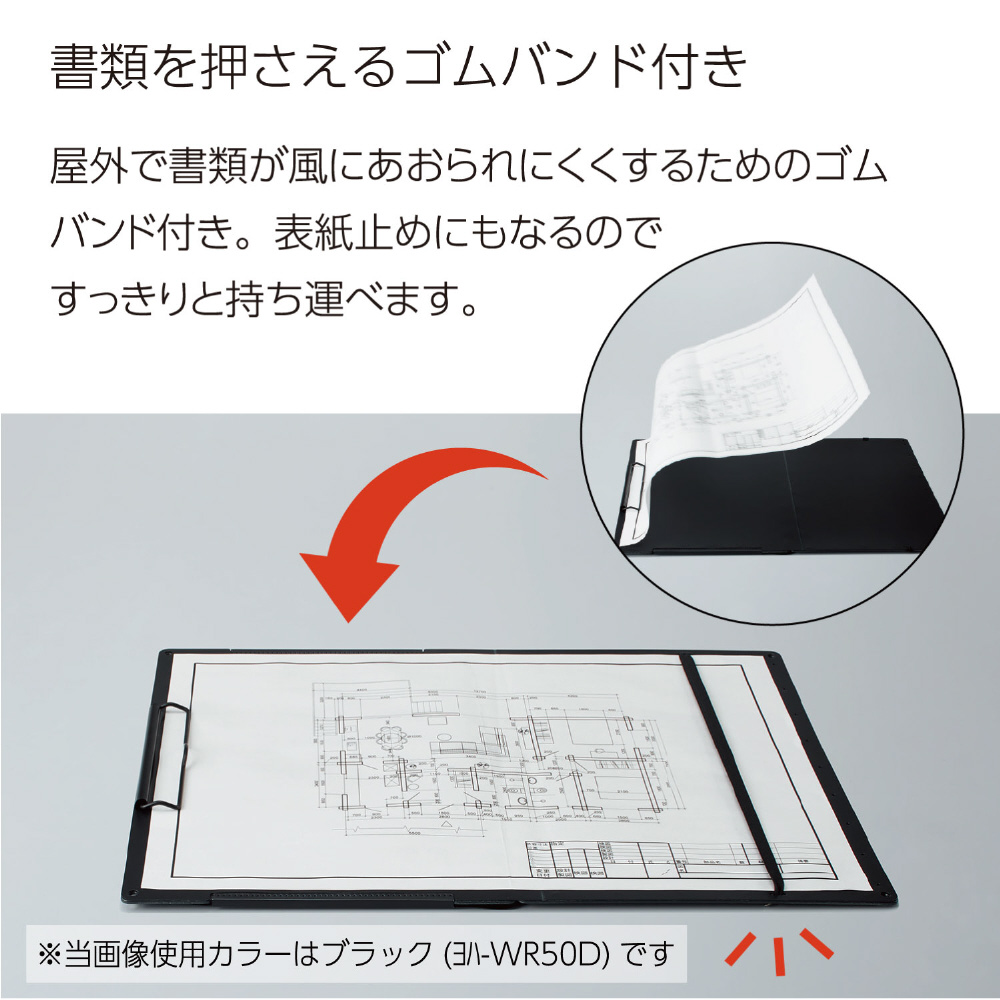 ●屋外で書類が風にあおられにくくするためのゴムバンド付き。表紙止めにもなるのですっきりと持ち運べます。
