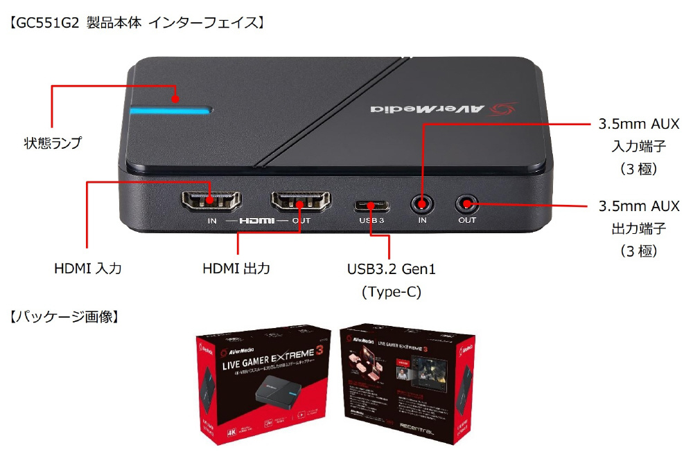 4K/30fpsの高画質録画やVRRパススルーに対応。3.5mm AUX入出力端子を備えるHDMIゲームキャプチャー