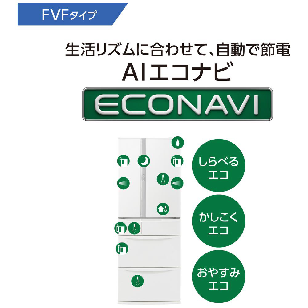 内容量451〜500Lクラスで業界トップクラスの薄い奥行63cm。生活に合わせて、3つのエコ機能が自動で節電「AIエコナビ」を搭載。