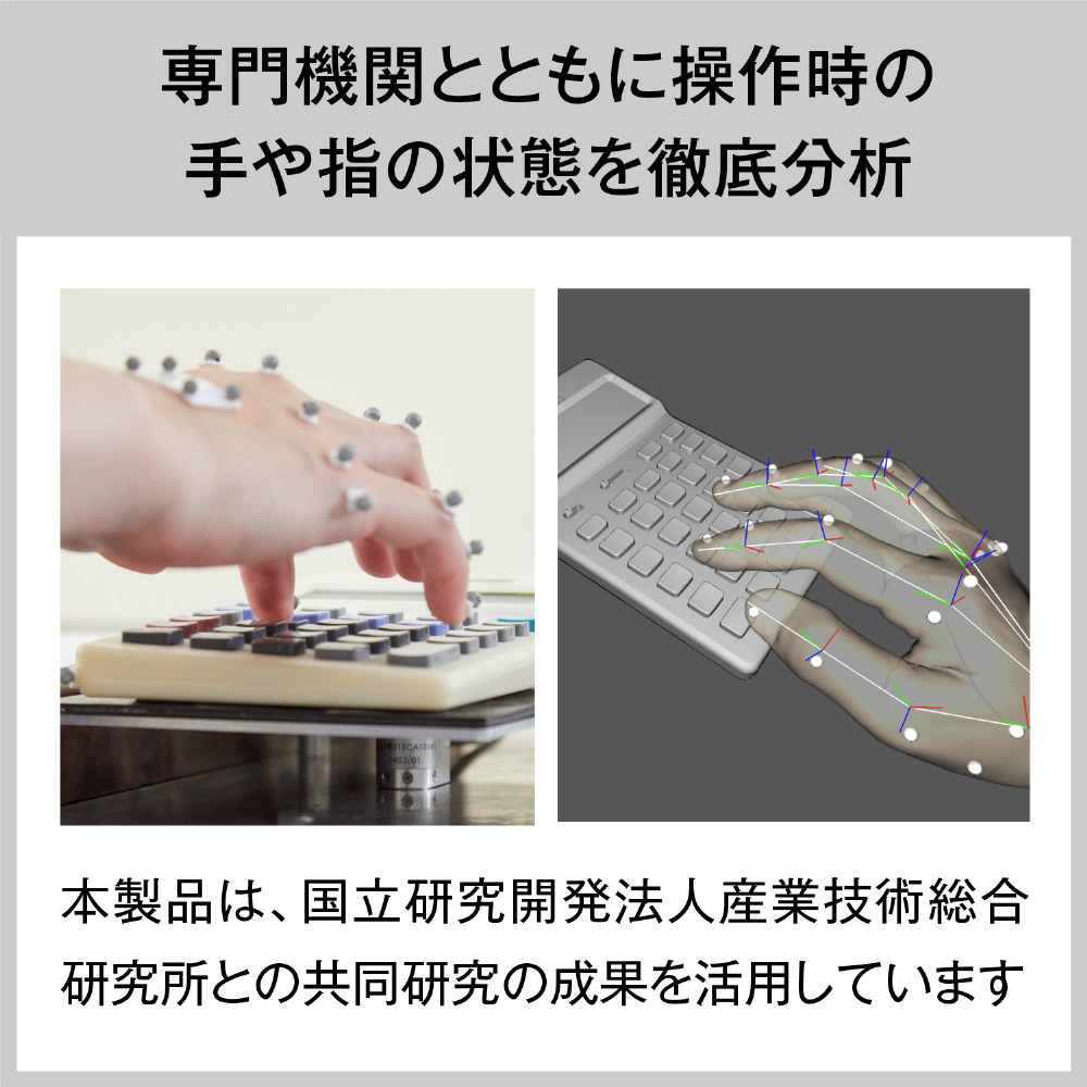 右手3〜5本の手指を使うとき、打ちやすい電卓とは。わたしたちは、操作時の手や指の状態を専門機関とともに徹底分析.。