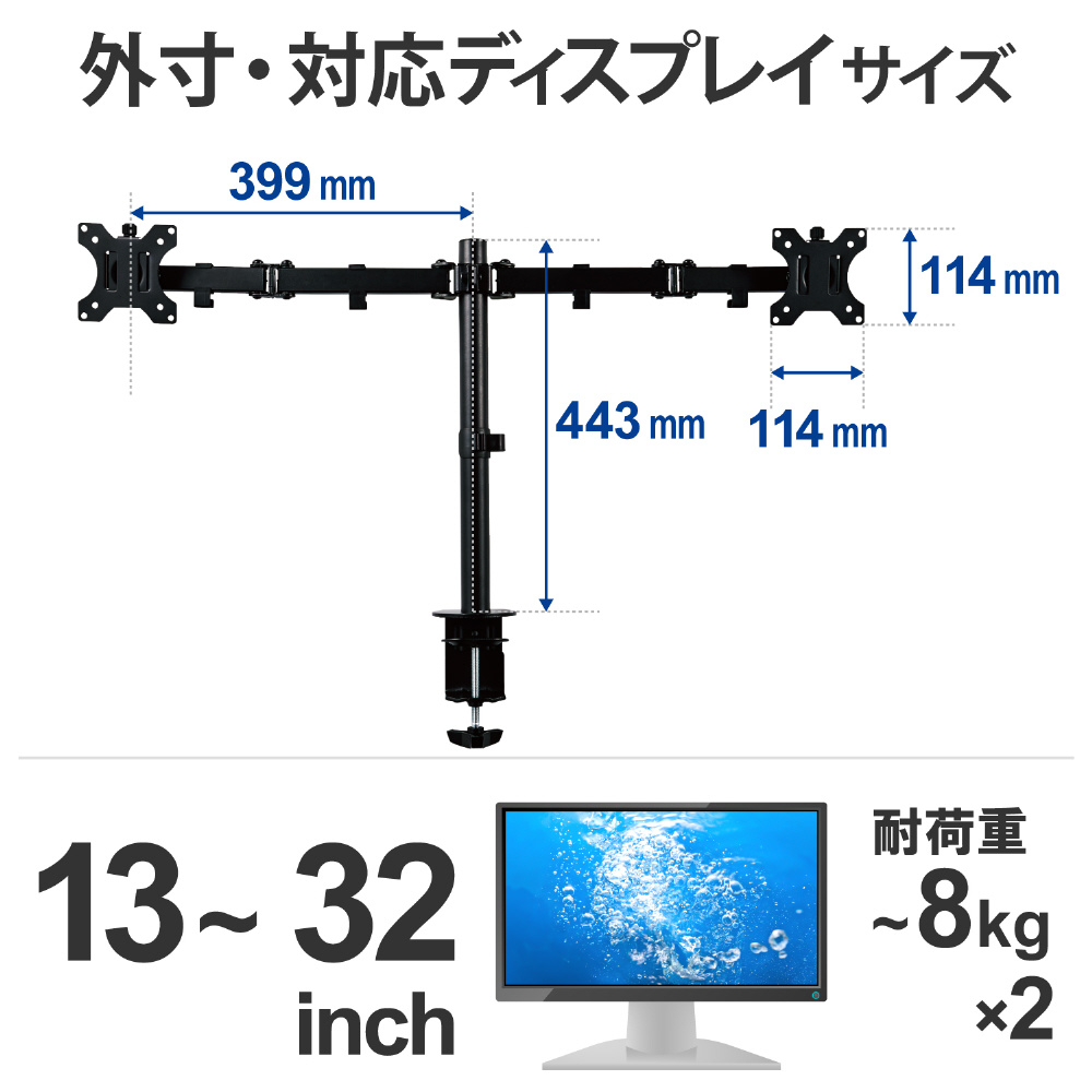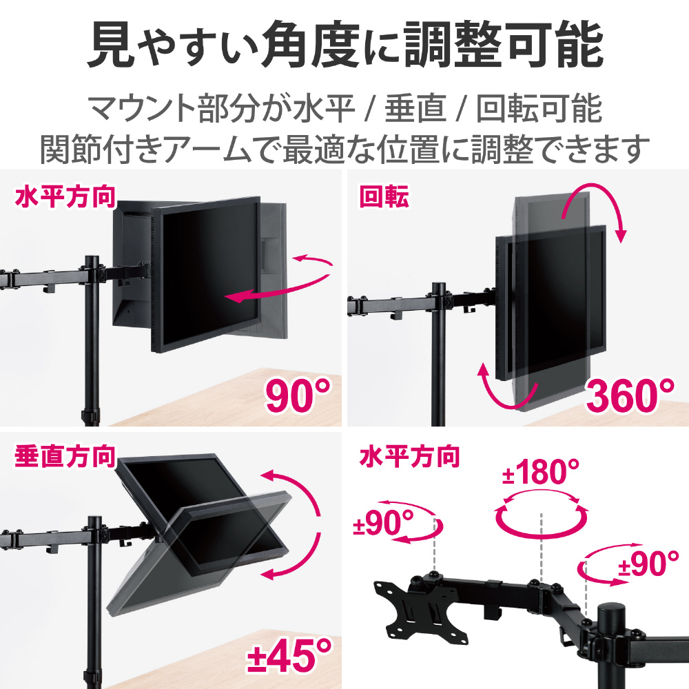 モニターの位置を自由に調整でき、デスクのスペースを有効活用!13〜32インチサイズのモニターに対応するロングアームタイプのダブルモニターアーム。
