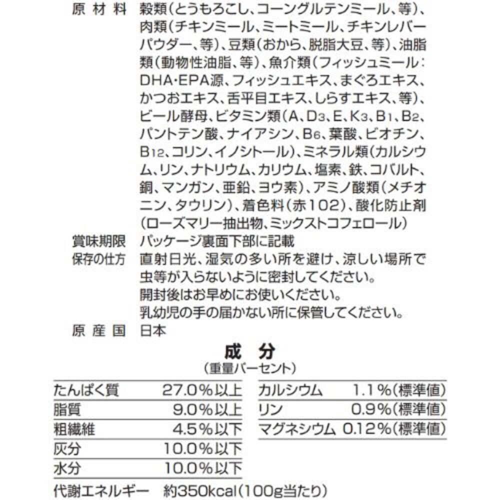 ●原材料:穀類(とうもろこし、菓子粉、コーングルテンミール、等)、肉類(ミートミール、チキンミール、チキンレバーパウダー、等)、豆類(おから、脱脂大豆、等)、魚介類(フィッシュミール:DHA・EPA源、フィッシュエキス、まぐろエキス、かつおエキス、舌平目エキス、しらすエキス、等)、油脂類(動物性油脂 、ガンマ−リノレン酸、等)、ビール酵母、卵類(ヨード卵粉末)、ビタミン類(A、D3、E、K3、B1、B2、パントテン酸、ナイアシン、B6、葉酸、ビオチン、B12、コリン、イノシトール)、ミネラル類(カルシウム、リン、ナトリウム、カリウム、塩素、鉄、コバルト、銅、マンガン、亜鉛、ヨウ素)、アミノ酸類(メチオニン、タウリン)、着色料(赤102)、酸化防止剤(ローズマリー抽出物、ミックストコフェロール)