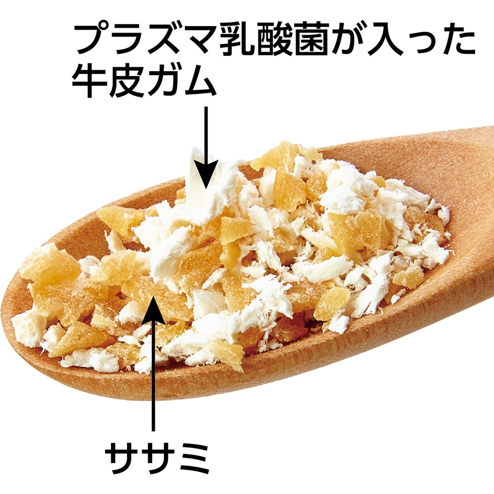 ●原材料:牛皮、肉類(鶏ササミ・鶏レバー)、米粉、でんぷん類、魚介類、チキンエキス、植物性油脂、酵母エキス、食塩、殺菌乳酸菌(プラズマ乳酸菌)、魚油(DHA・EPA含有)、卵黄粉末(オボプロン含有)、脱脂粉乳、加工でんぷん、グリセリン、リン酸塩(K・Na)、増粘安定剤(グァーガム)、酸化防止剤(亜硫酸Na・V.E)