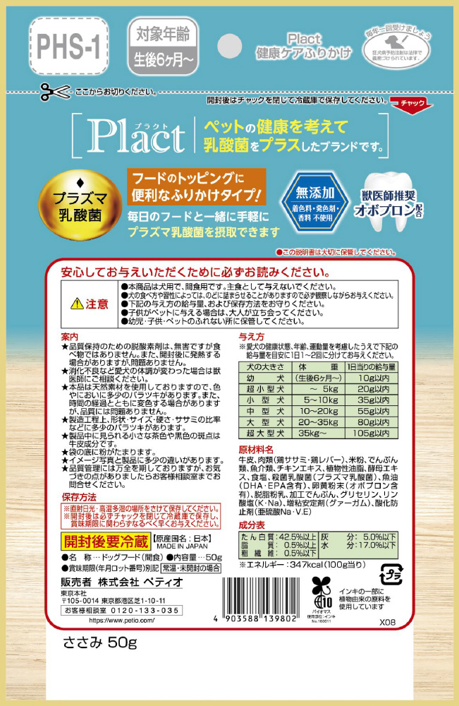 Plactはペットの健康を考えて乳酸菌をプラスしたブランドです。フードのトッピングに便利なふりかけタイプ!毎日のフードと一緒に手軽にプラズマ乳酸菌を摂取できます。獣医師推奨オボプロン配合。着色料・発色剤・香料無添加。