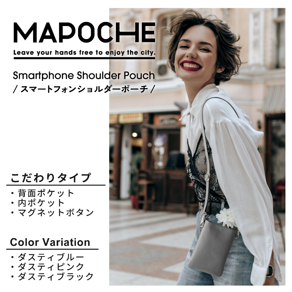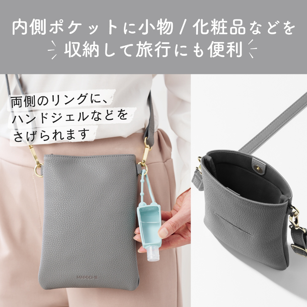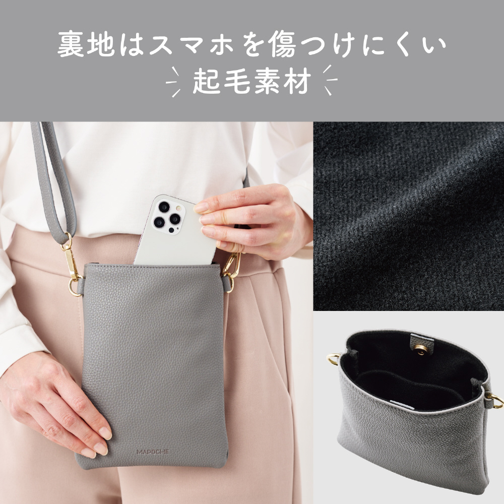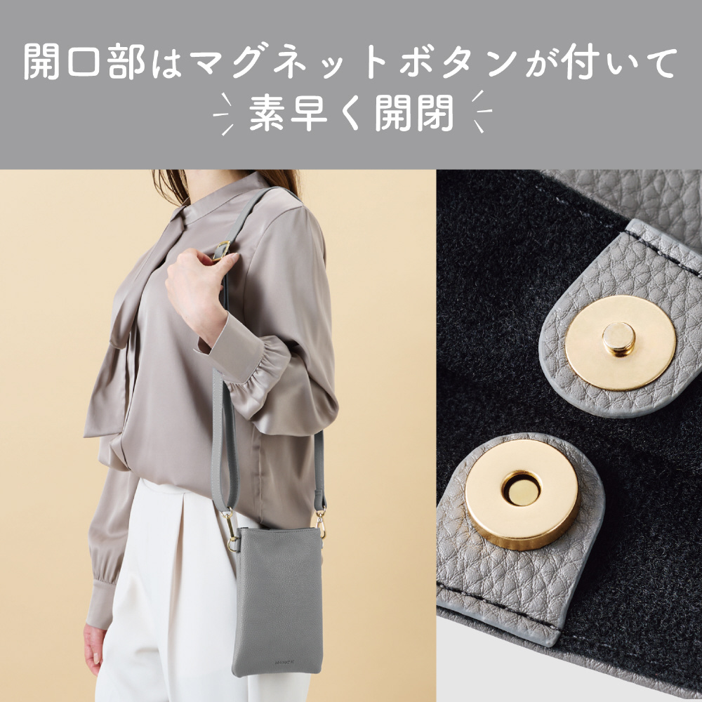 ちょっとした小物や化粧品も入れたい方に最適!スマートフォンはもちろん、お気に入りのミニウォレットやICカードも入れられるショルダーポーチです。肩掛けなので両手があいて、お出かけやお仕事、お買い物にも便利です。また柔らかく上品なライチ紋のソフトレザー素材なので、さまざまなシーンで使えます。
