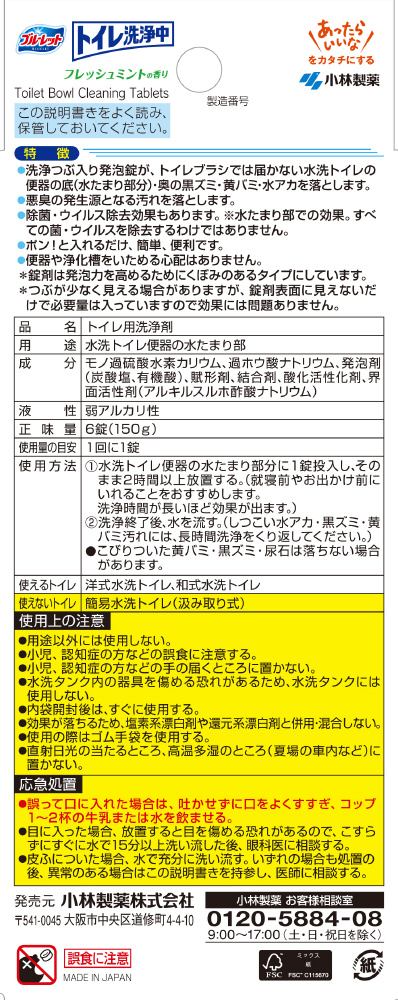 ●洗浄つぶ入り発泡錠が、トイレブラシでは届かない水洗トイレの便器の底(水たまり部分)・奥の黒ズミ・黄バミ・水アカを落とします。●悪臭の発生源となる汚れを落とします。●除菌・ウイルス除去効果もあります。※水たまり部での効果。すべての菌・ウイルスを除去するわけではありません。●ポン!と入れるだけ、簡単、便利です。●便器や浄化槽をいためる心配はありません。